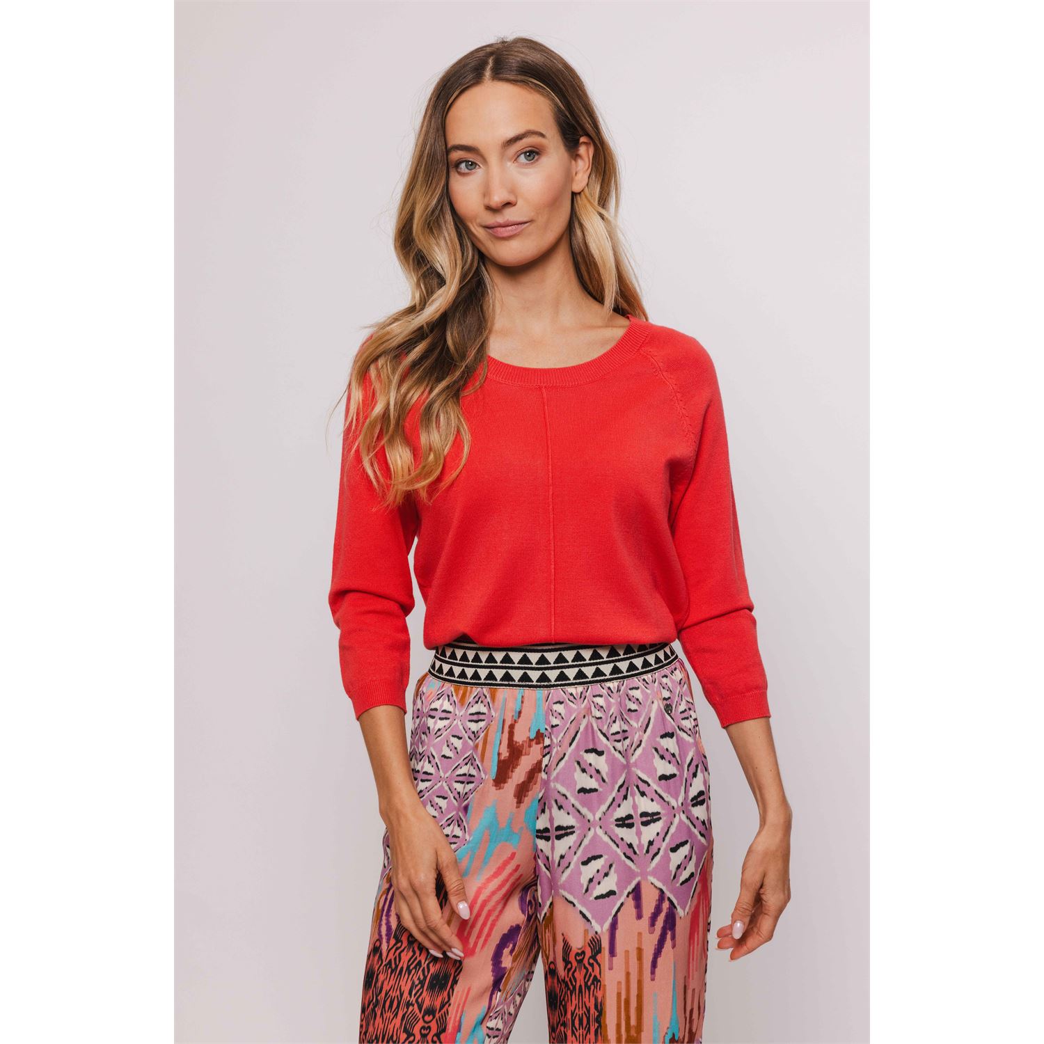Fijn gebreide trui in viscose mix garen. Deze trui heeft een raglan mouw, ronde hals en speels splitje aan de achterzijde.