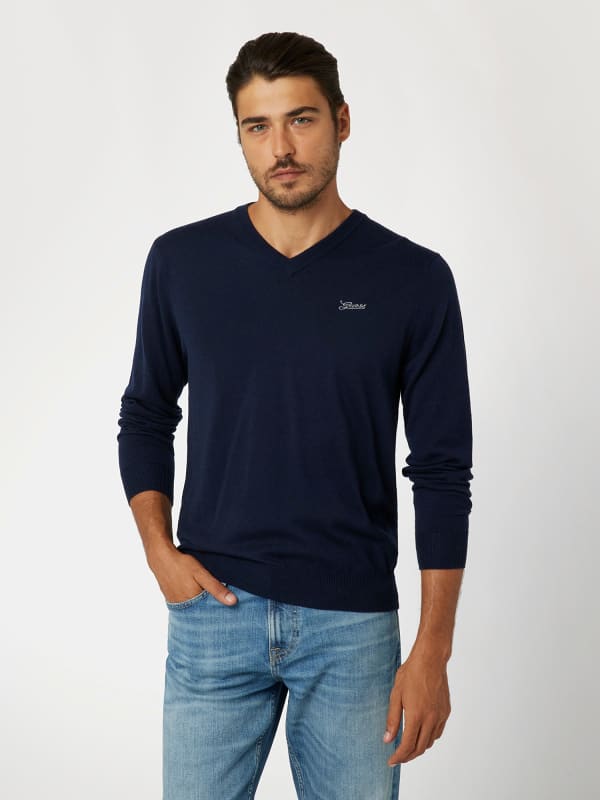 Trui van gemengde wol en zijde.Contrasterende geborduurd logootje op de borst.V-hals, lange mouwen.Dun geribd op de hals, manchetten en zoom.Slim fit.Het model draagt maat M.Zie onze bovenstaande maattabel.Totale lengte: 68 cm / 26,8 inch.Mouwlengte: 64 cm / 25,2 inch.Valt normaal op maat.