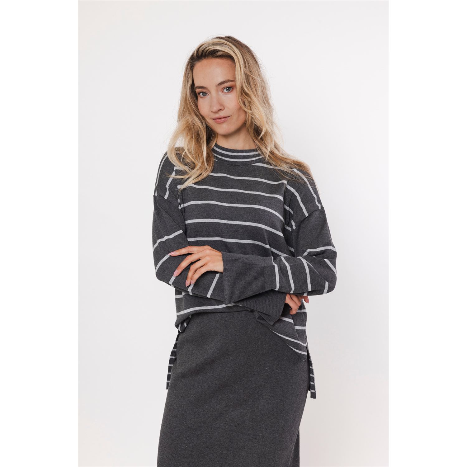 Fijn gebreide streep trui in viscose mix garen. De trui heeft een losvallende fit en een rib gebreide mock neck. Met splitten aan onderkant body en mouwuiteinde. Speels lengteverschil voor en achterkant trui.