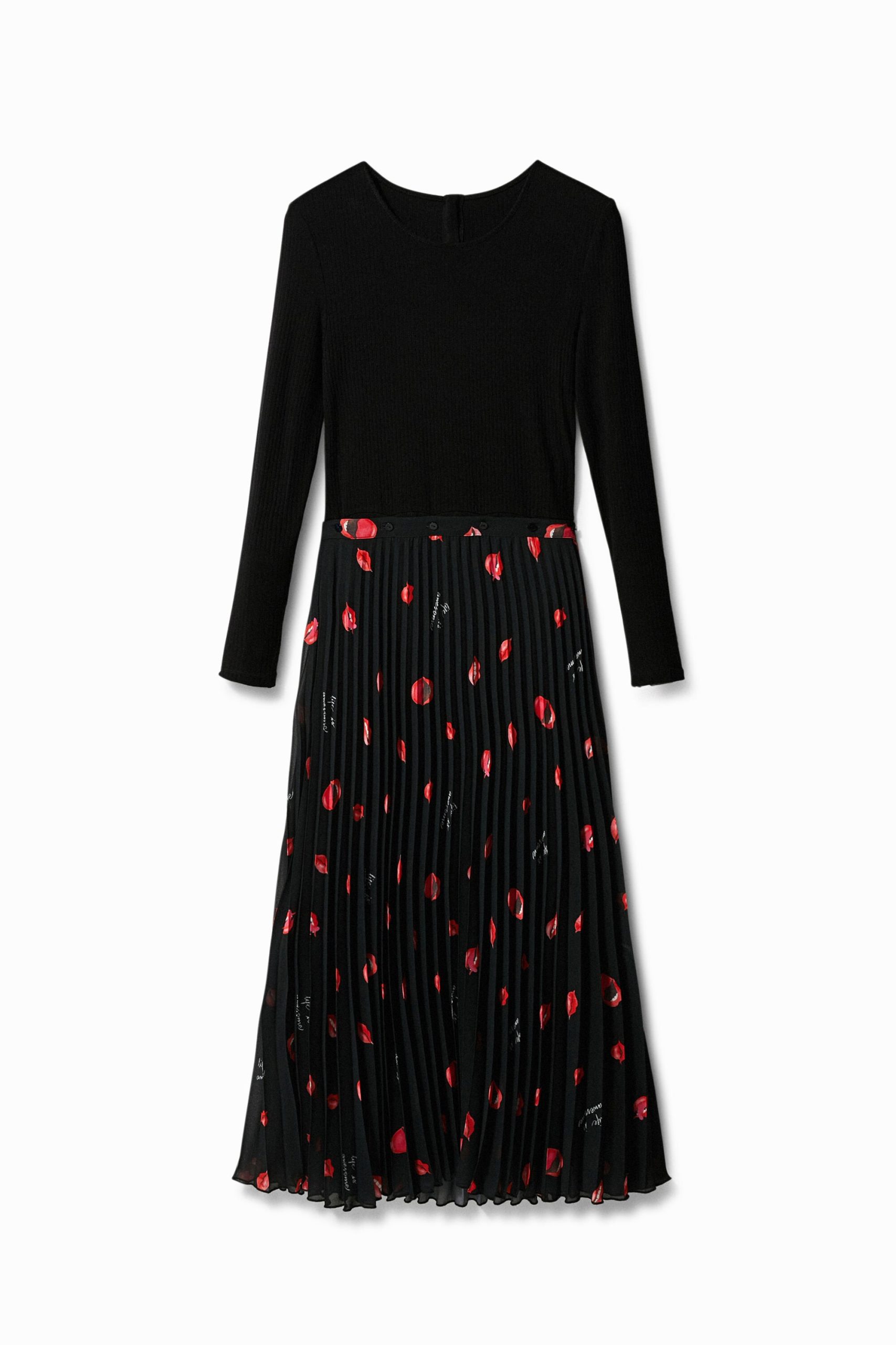 Deze slim fit jurk bestaat uit twee delen die je samen of apart kunt dragen: een aansluitende effen top en een zwierige geplisseerde midirok met een print van lippen en “Love power”. Drie kledingstukken in één!