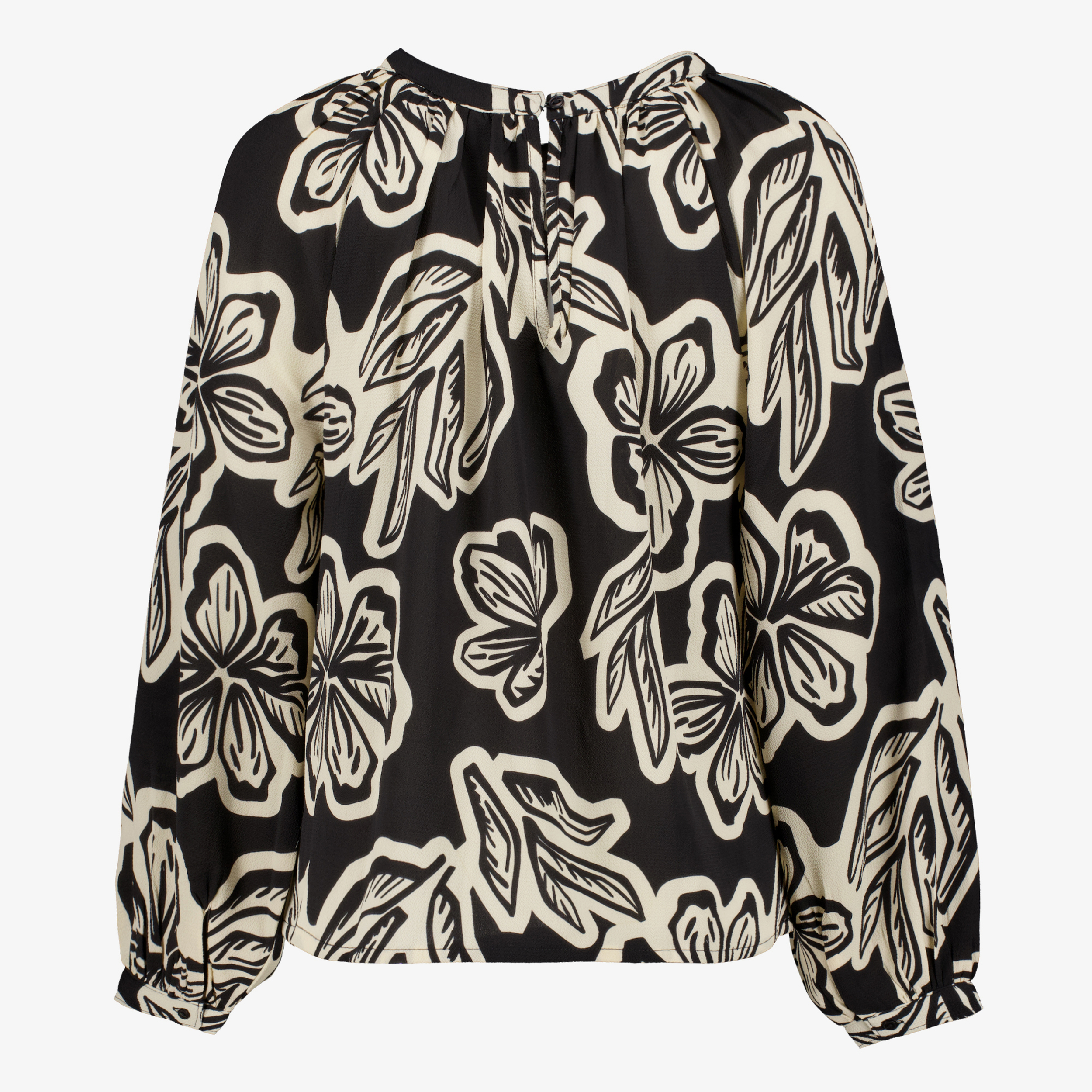 Zwarte blouse met een witte bloemenprint voor dames. Voorzien van een ronde hals met een sluiting aan de achterkant en lange mouwen met knoopsluiting bij de polsen. De blouse is gemaakt van 98% polyester en 2% elastaan.