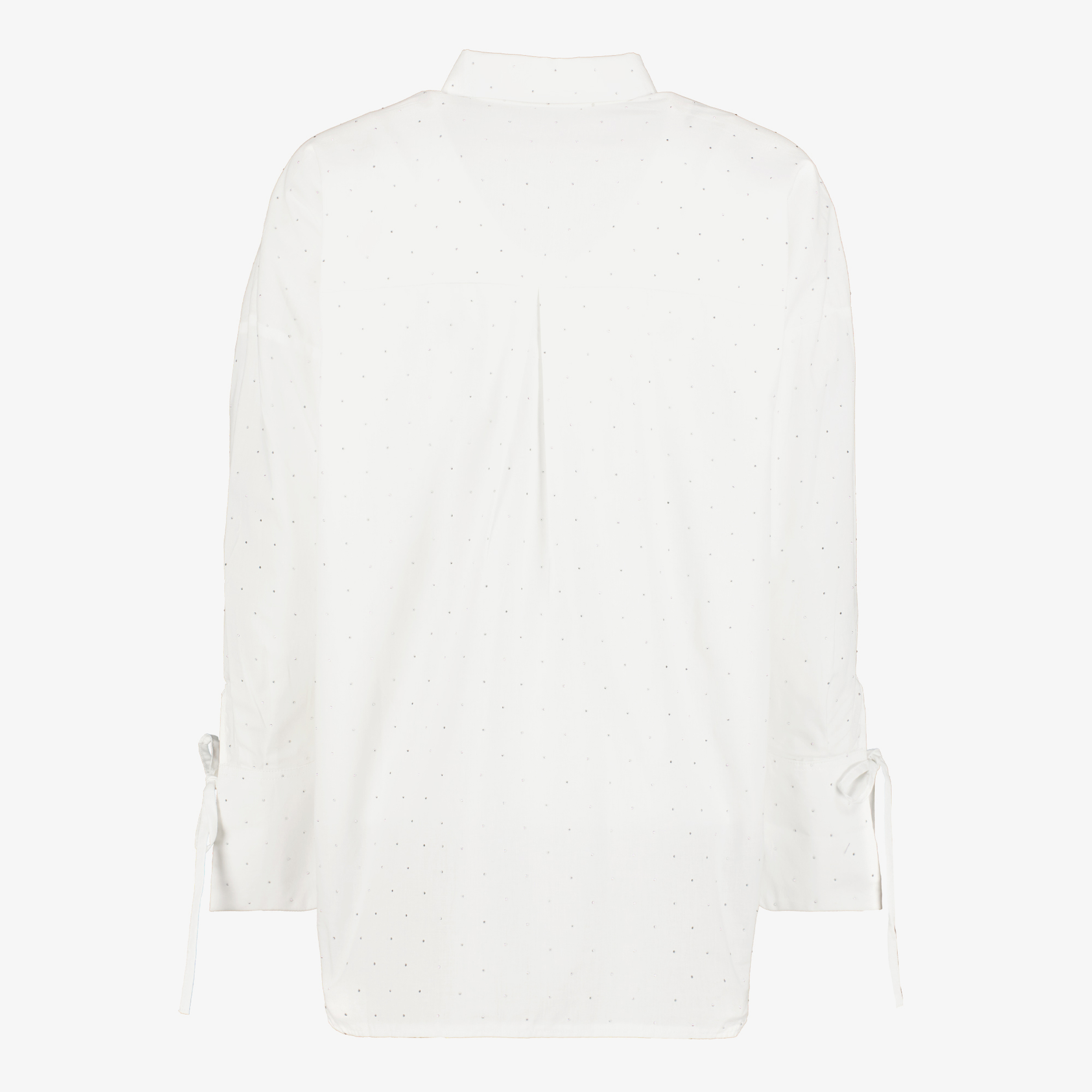 Witte blouse voor dames. Voorzien van knoopsluitingen, een kraagje en een borstzakje. De overhemdblouse heeft strikjes bij de mouwen en is iets langer aan de achterzijde. Gemaakt van 100% katoen en versierd met subtiele strass steentjes.