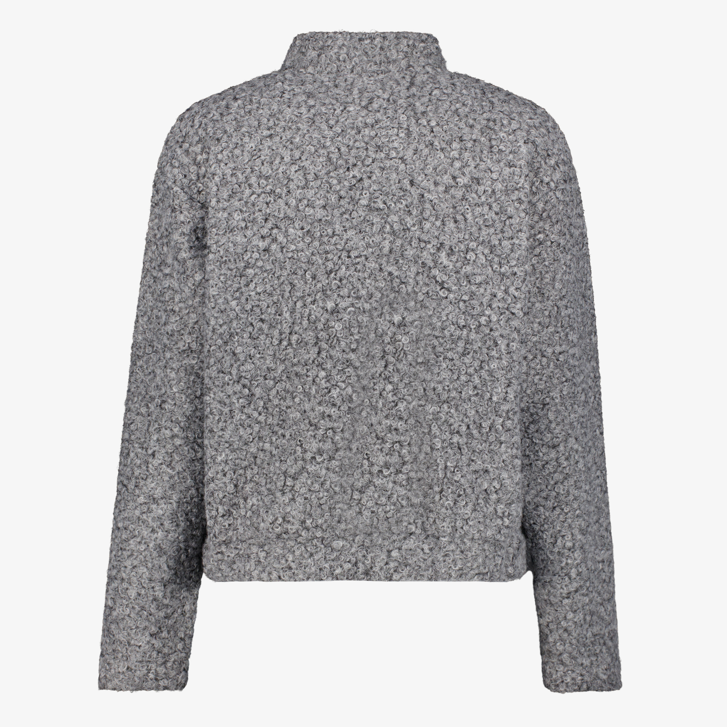 Grijze bomber jas met boucle structuur voor dames. Voorzien van een opstaand kraagje, twee zakken met ritssluiting en een elastische boord aan de onderkant van de jas. De bomber jas heeft een wollige structuur (boucle) en is gemaakt van 100% polyester.