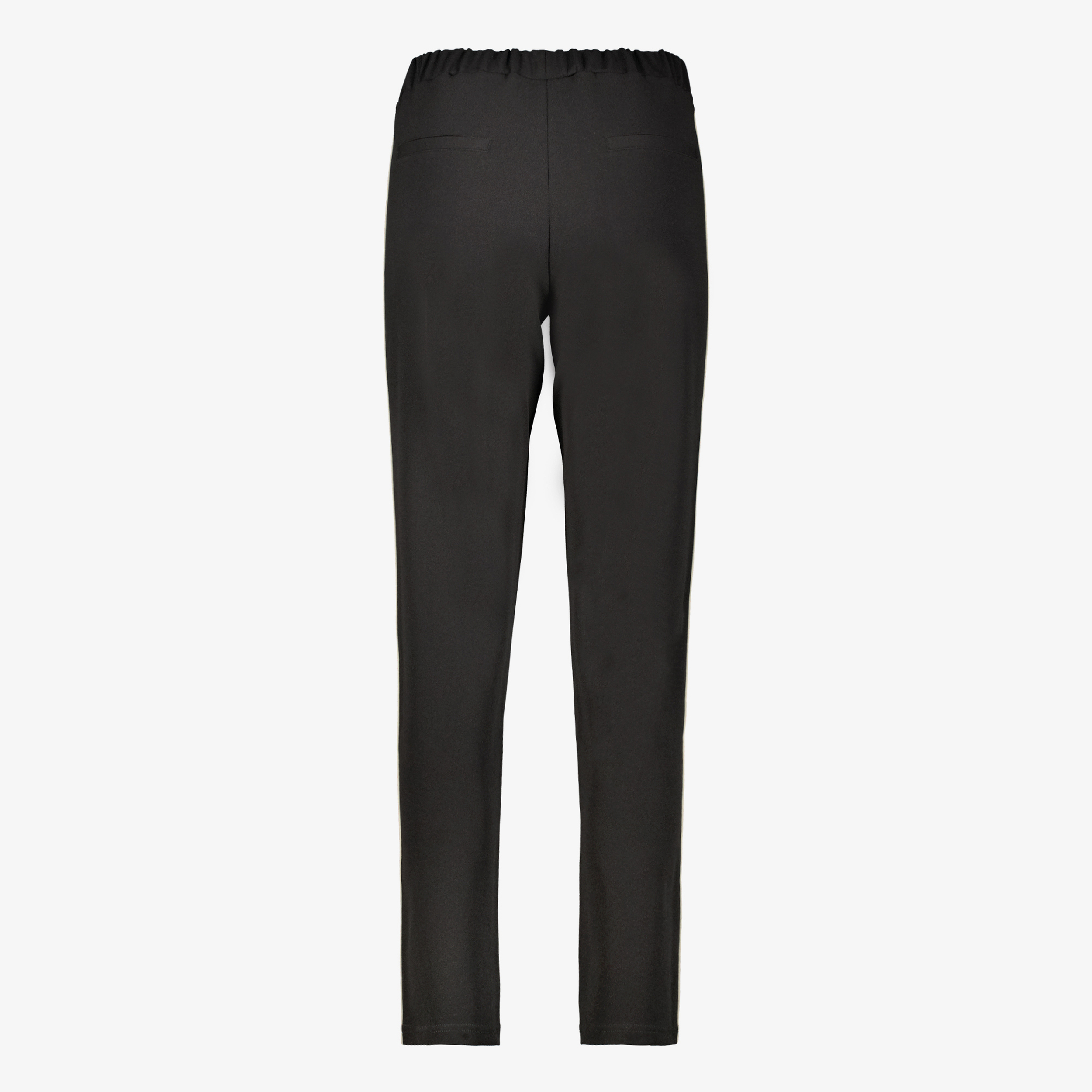 Zwarte broek voor dames. Voorzien van een elastische tailleband, twee steekzakken en een witte bies langs de benen. De comfy broek is gemaakt van 95% polyester en 5% elastaan.