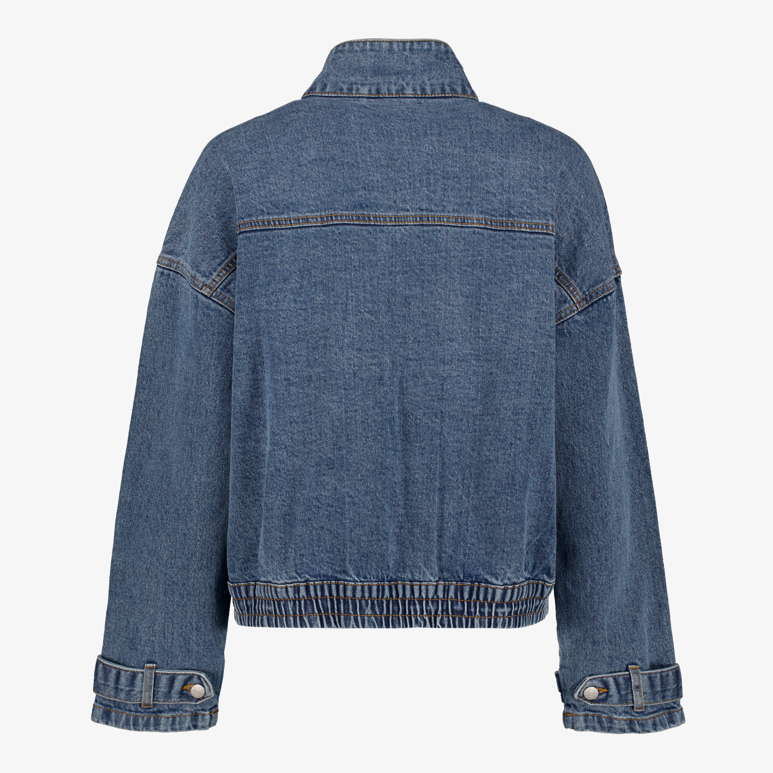 Donkerblauwe denim jas voor dames van TwoDay. Voorzien van een hoge kraag, een knoopsluiting en twee steekzakken aan de voorkant. De jas heeft lange mouwen met riempjes bij de polsen en is gemaakt van 99% katoen en 1% elastaan.