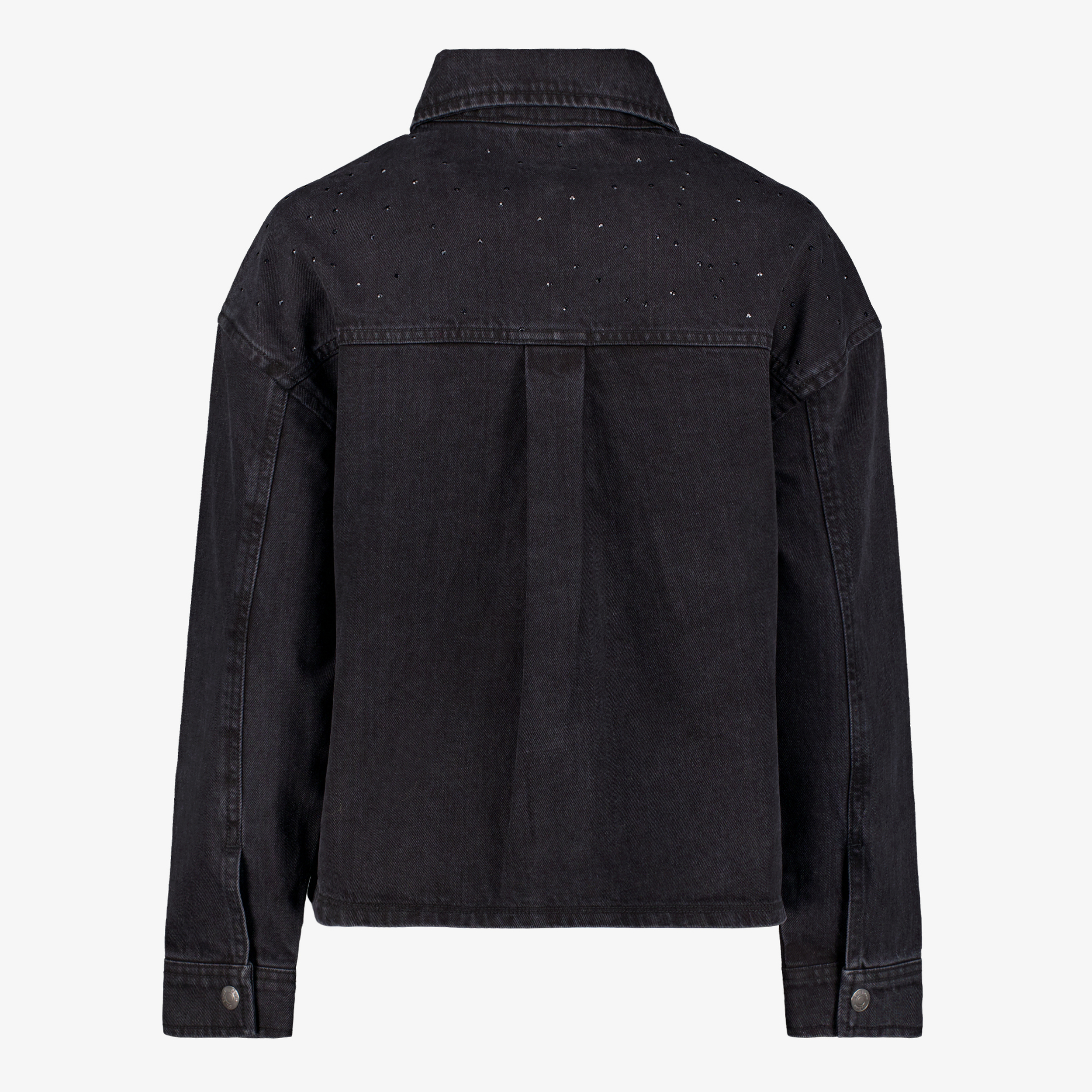 Zwart denim overshirt voor dames uit de TwoDay collectie. Voorzien van een omgeslagen kraag, een knoopsluiting, lange mouwen met knoopsluiting bij de polsen en twee borstzakken. Het overshirt is aan de bovenkant versierd met strass steentjes en is gemaakt van 100% katoen.