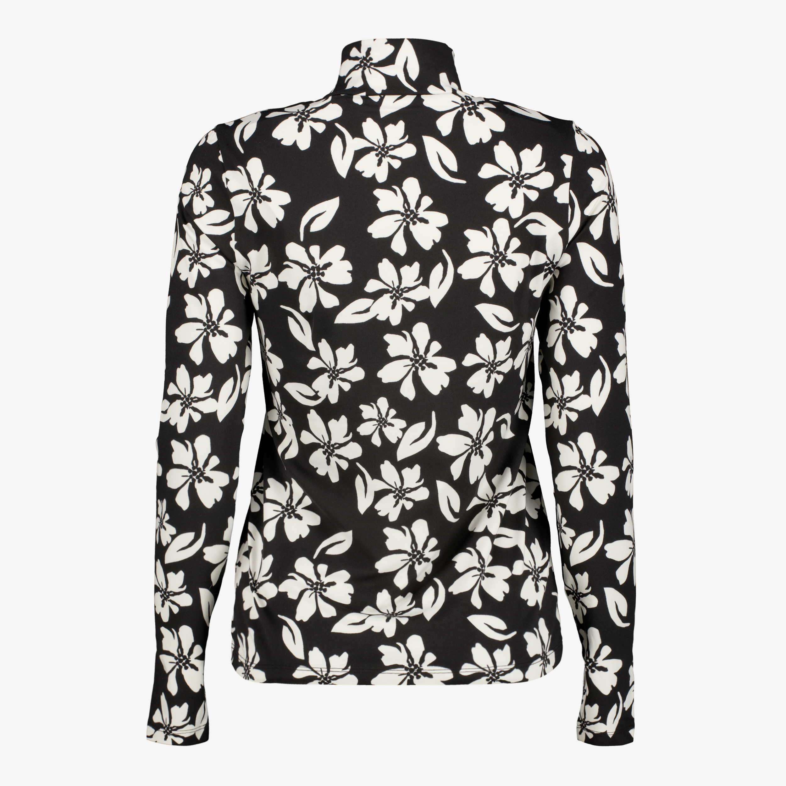 Zwart-witte top met een witte bloemenprint voor dames. Voorzien van een colkraag en lange mouwen. Dit artikel is gemaakt van 90% GRS gecertificeerd gerecycled polyester (TE-303856) en 10% elastaan. Combineer de top met de bijpassende broek en maak je outfit compleet!