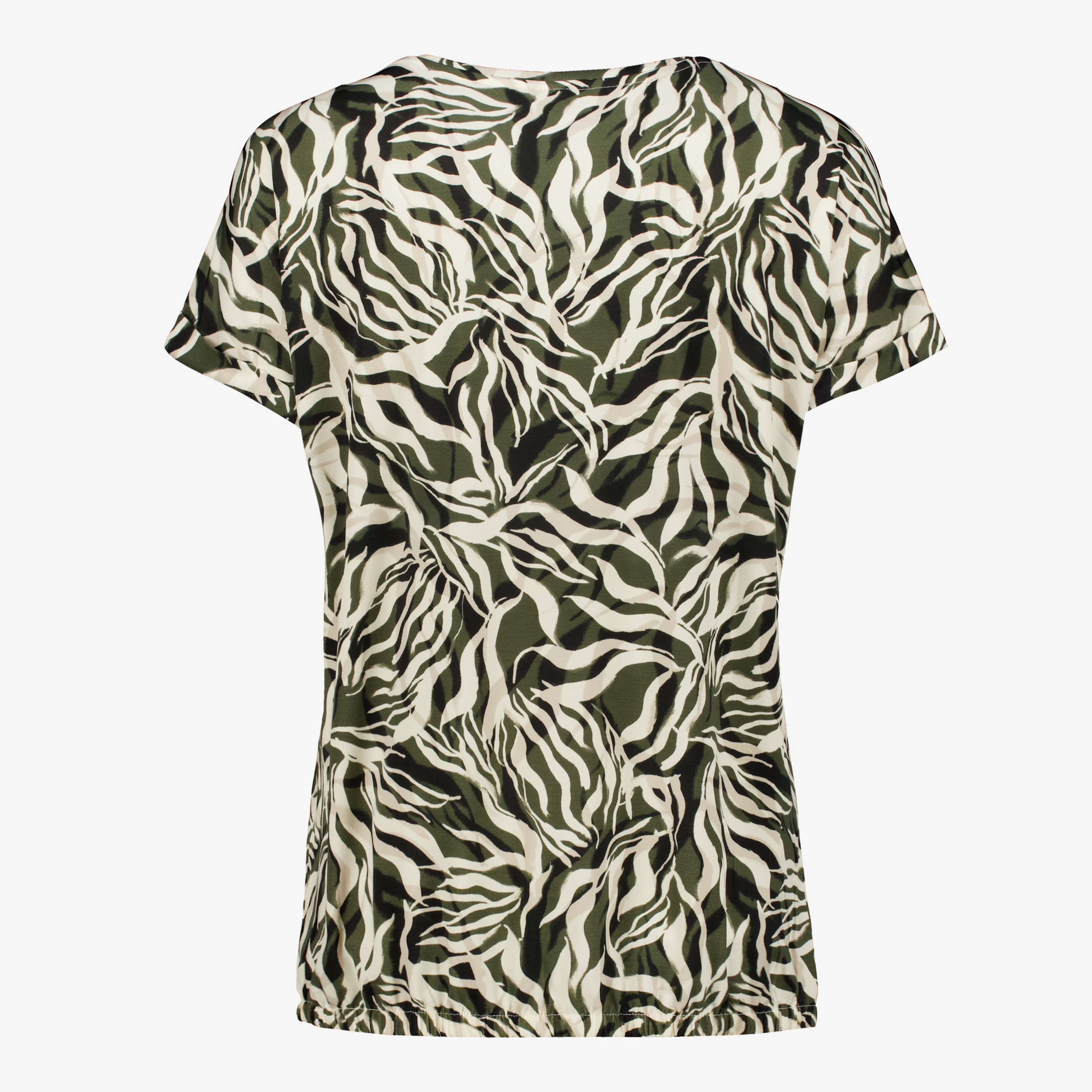 Groen-beige top voor dames uit de TwoDay collectie. Voorzien van een ronde hals, korte mouwen en een botanische print. Gemaakt van 95% polyester en 5% elastaan.
