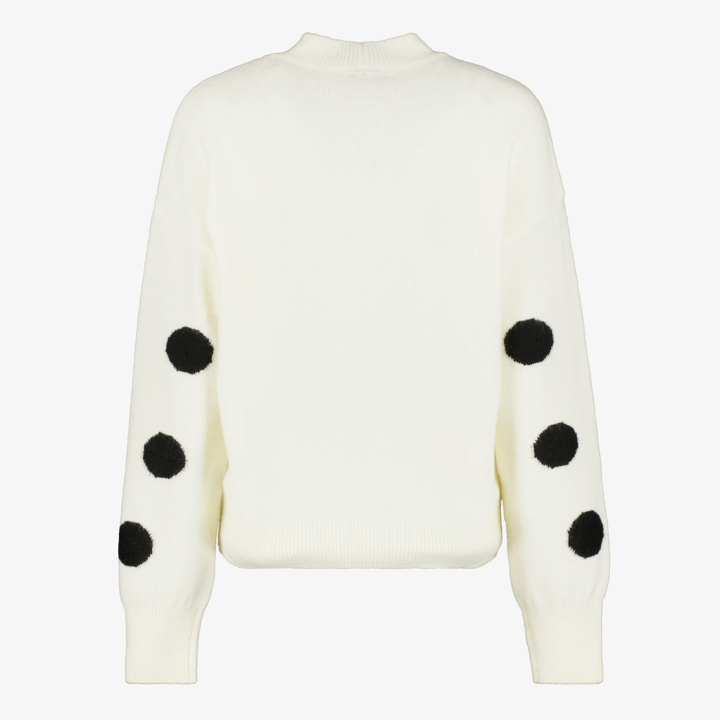Trui voor dames van het merk TwoDay. De trui is wit met zwarte stippen, heeft een ronde hals en lange mouwen. Gemaakt van 68% acryl, 28% polyester en 4% elastaan.