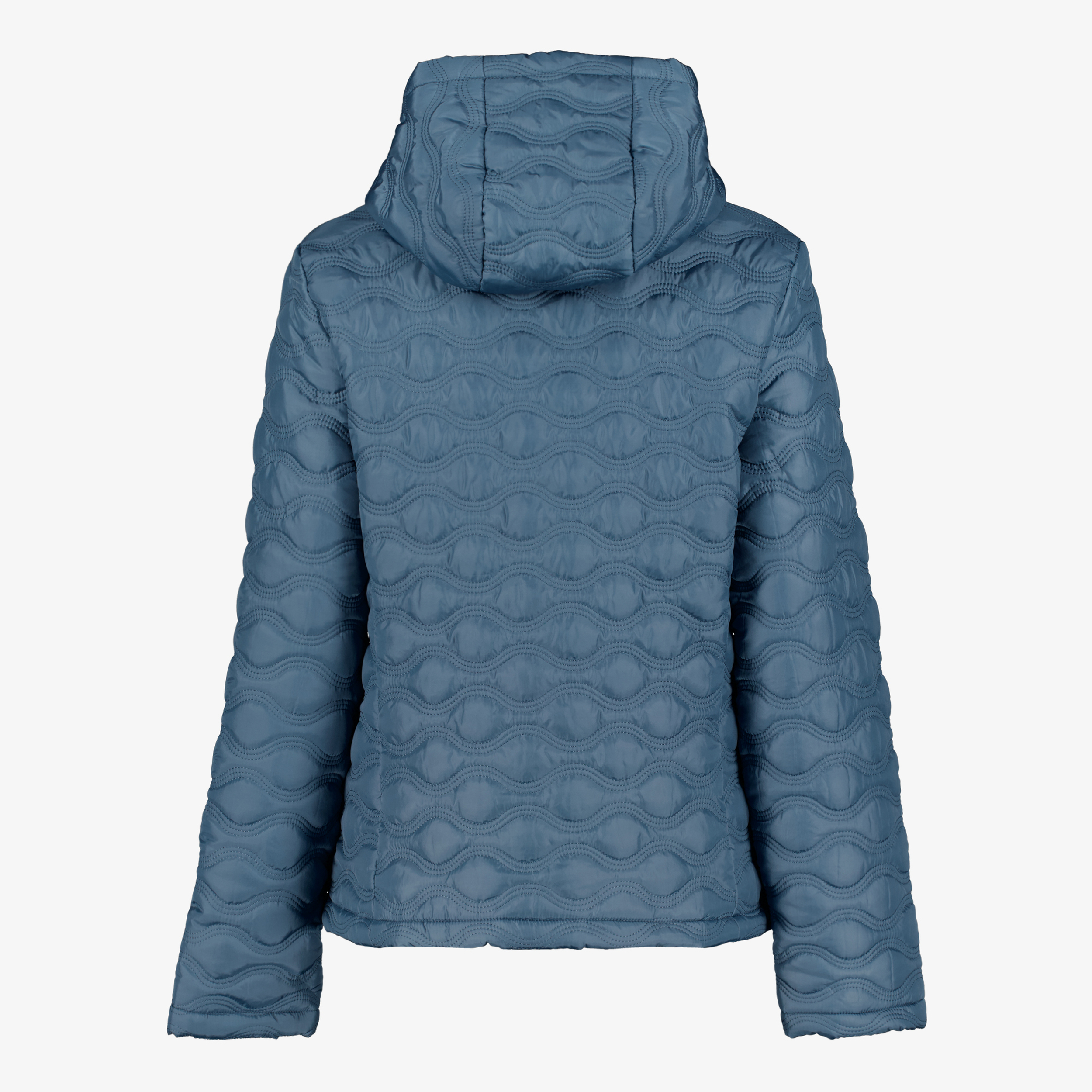 Blauwe, licht gewatteerde jas voor dames van TwoDay. Voorzien van een vaste capuchon met aantrekkoordjes, een ritssluiting met kinbescherming en twee zakken met ritssluiting aan de voorkant. De jas heeft sierlijke, golvende stiklijnen en is gemaakt van 100% polyester.