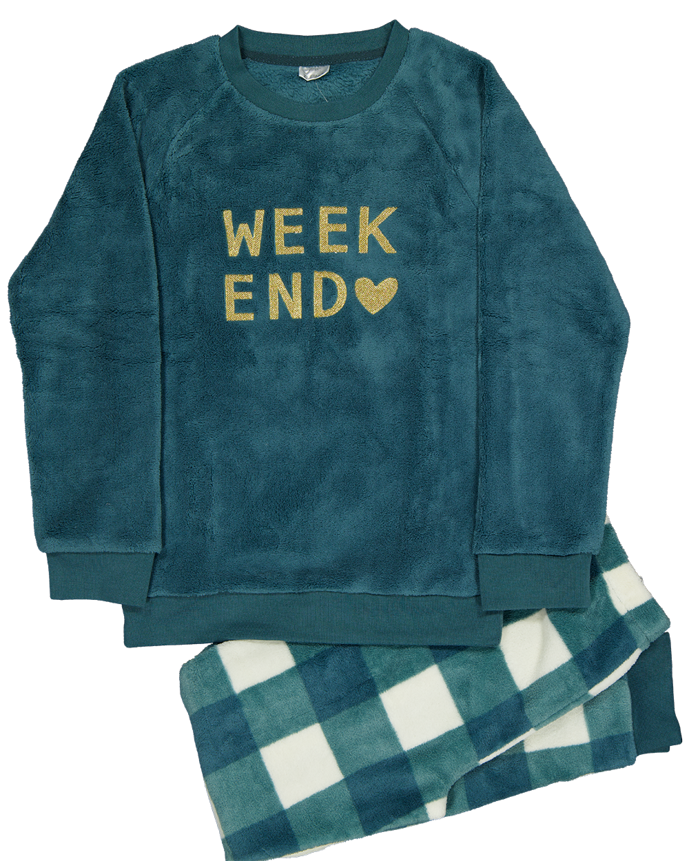 Deze blauwe twosie voor meisjes is gemaakt van zachte coral fleece van 100% polyester. De trui heeft een ronde hals en een vriendelijke weekendtekst met hartje. De broek heeft een blauw-wit ruitpatroon. Door het warme en comfortabele materiaal is deze set fijn om thuis te dragen op een ontspannen dag. Praktisch voor koude dagen en makkelijk te onderhouden.