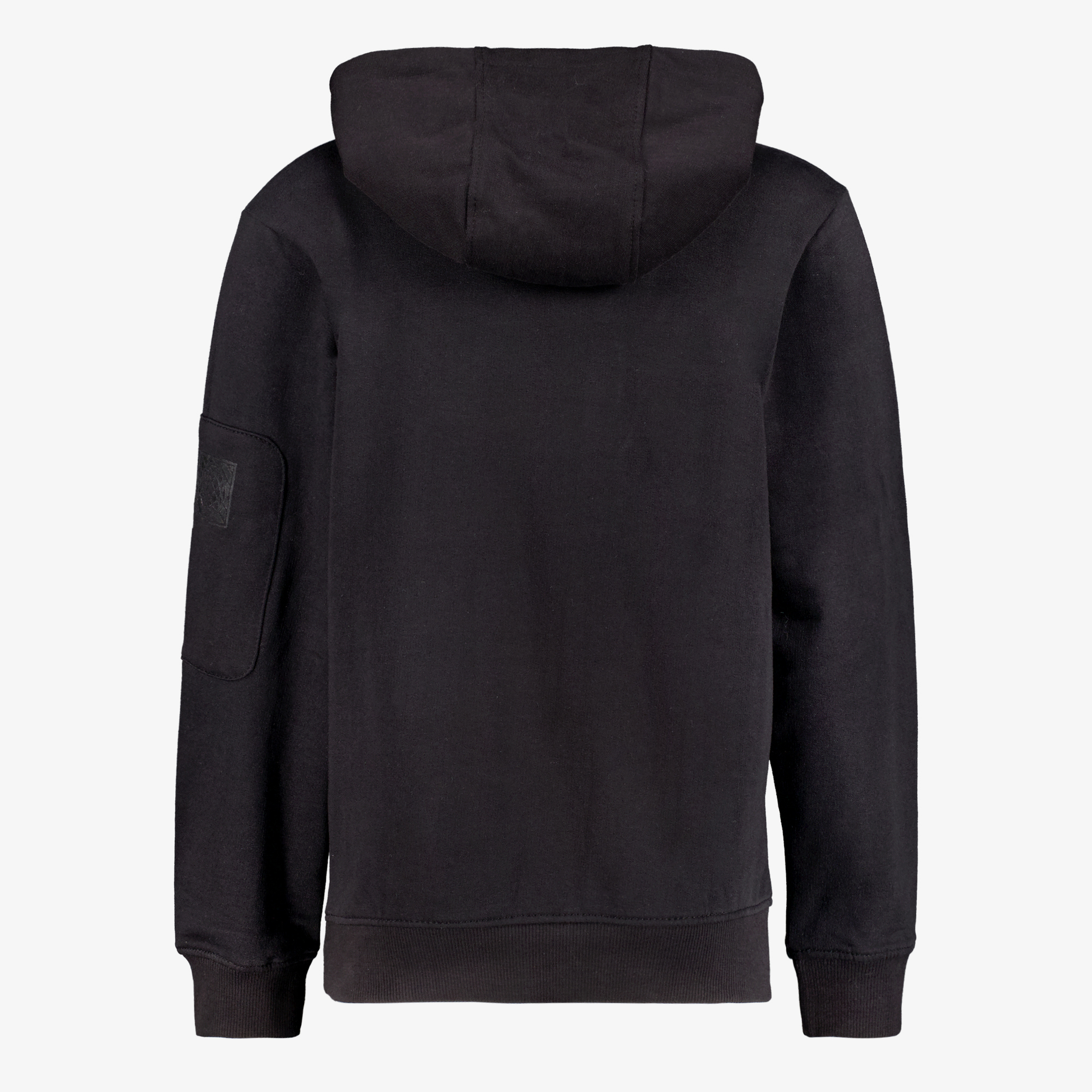 Zwarte hoodie voor jongens van Unsigned. Voorzien van een capuchon, een zakje met ritssluiting op de mouw, twee zakken met ritssluiting aan de voorkant en een tekstopdruk op de borst. De hoodie is gemaakt van 80% katoen en 20% polyester.