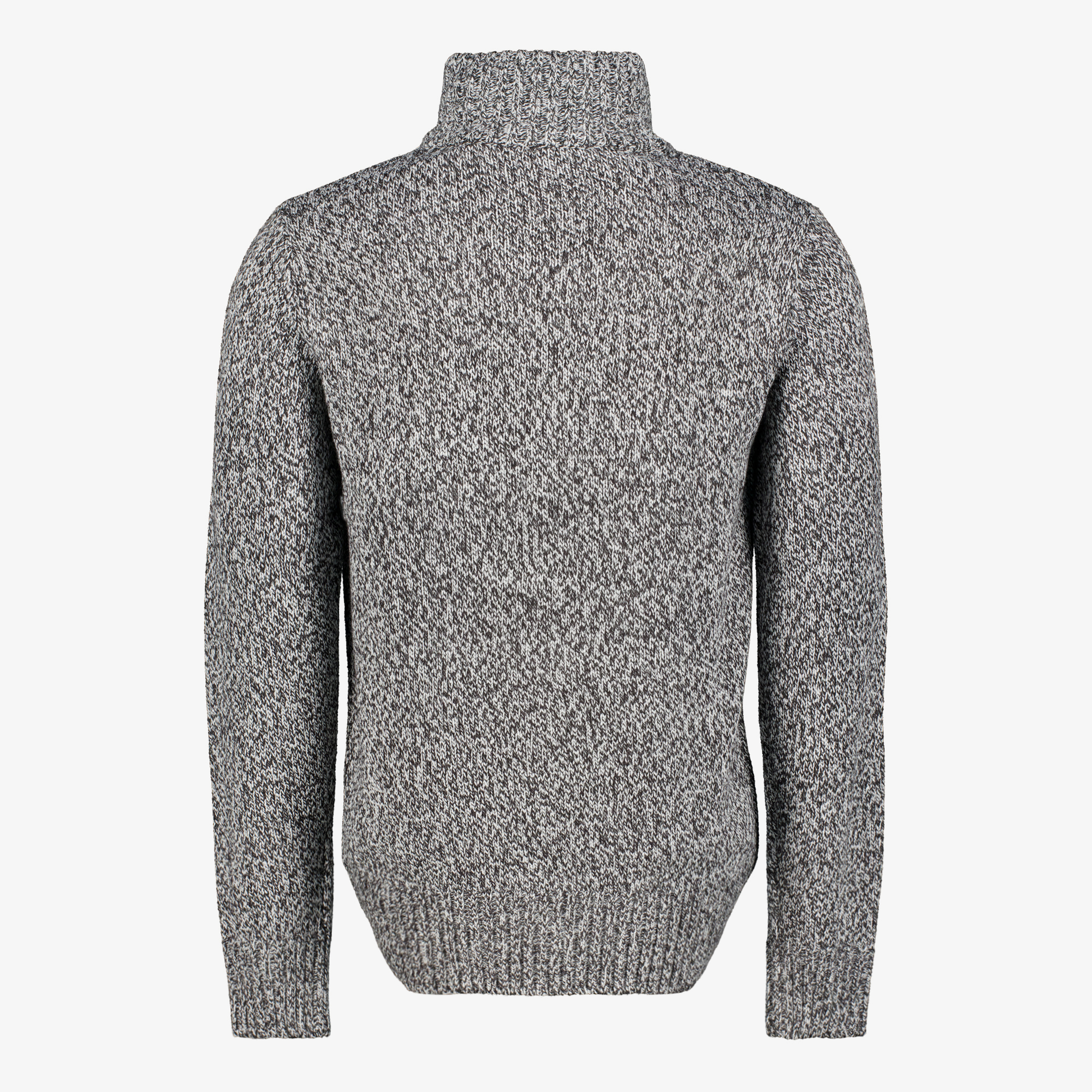Grijze, gebreide coltrui voor heren van Unsigned. Voorzien van een hoge kraag met korte rits, lange mouwen en een bruin embleem aan de onderkant. Gemaakt van 100% acryl.