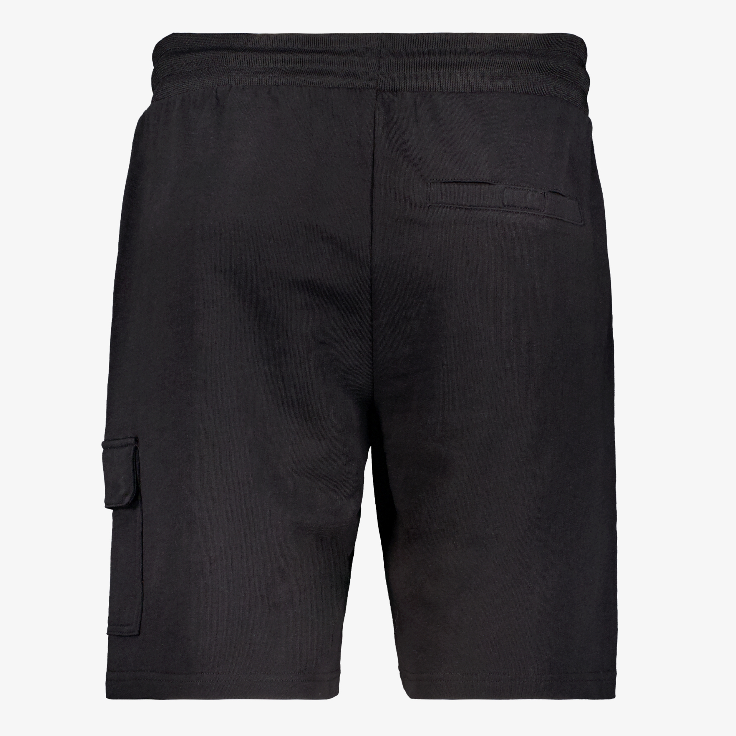 Zwarte sweatshort voor heren. Voorzien van een elastische tailleband met aantrekkoordjes en twee steekzakken. De sweatshort heeft een klepzak op het bovenbeen en is gemaakt van 100% katoen.