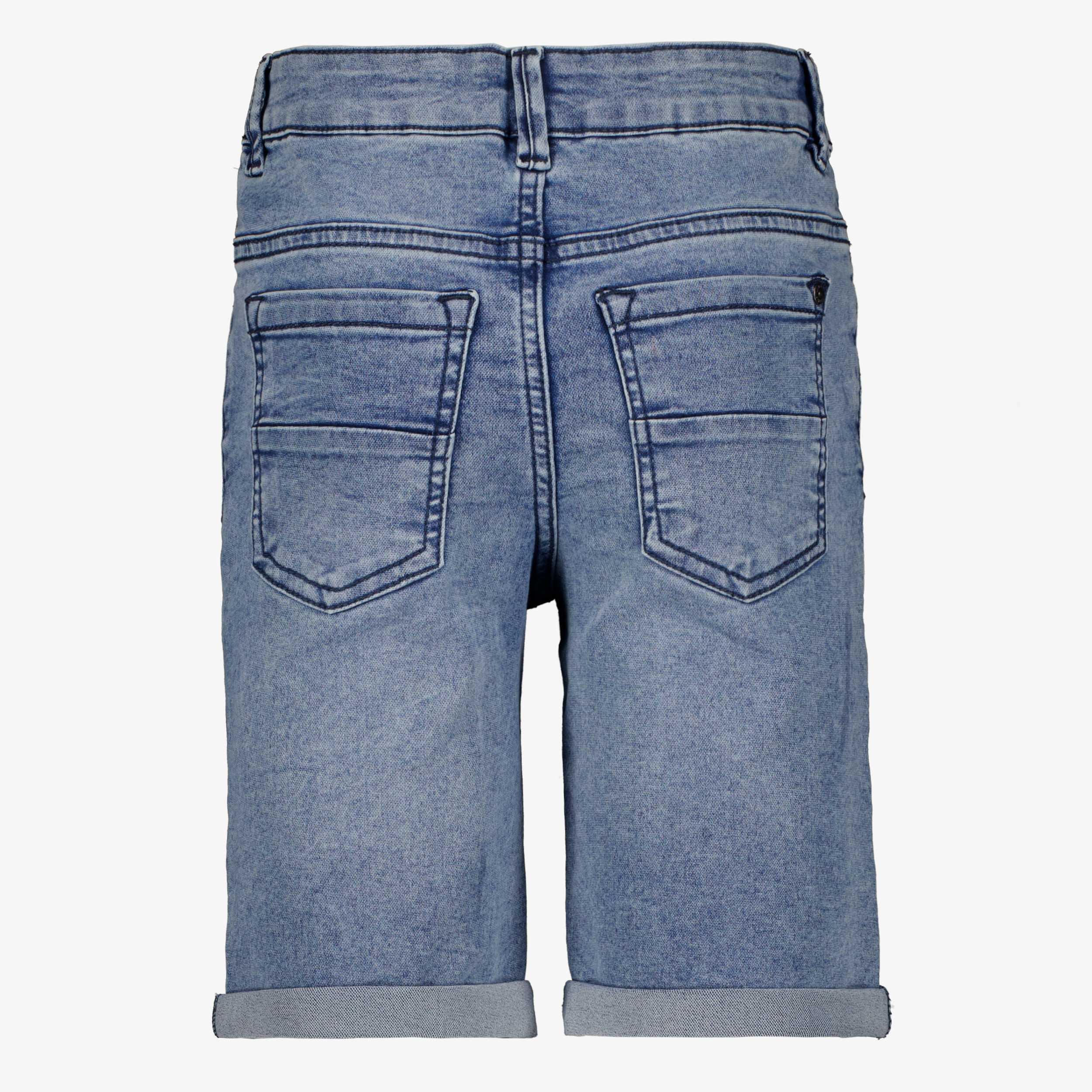 Blauwe denim short voor jongens. Voorzien van een knoop- en ritssluiting, riemlusjes in de boord en twee voor- en achterzakken. De korte spijkerbroek heeft een omslag bij de broekspijpen en is gemaakt van 72% katoen, 26% polyester en 2% elastaan.