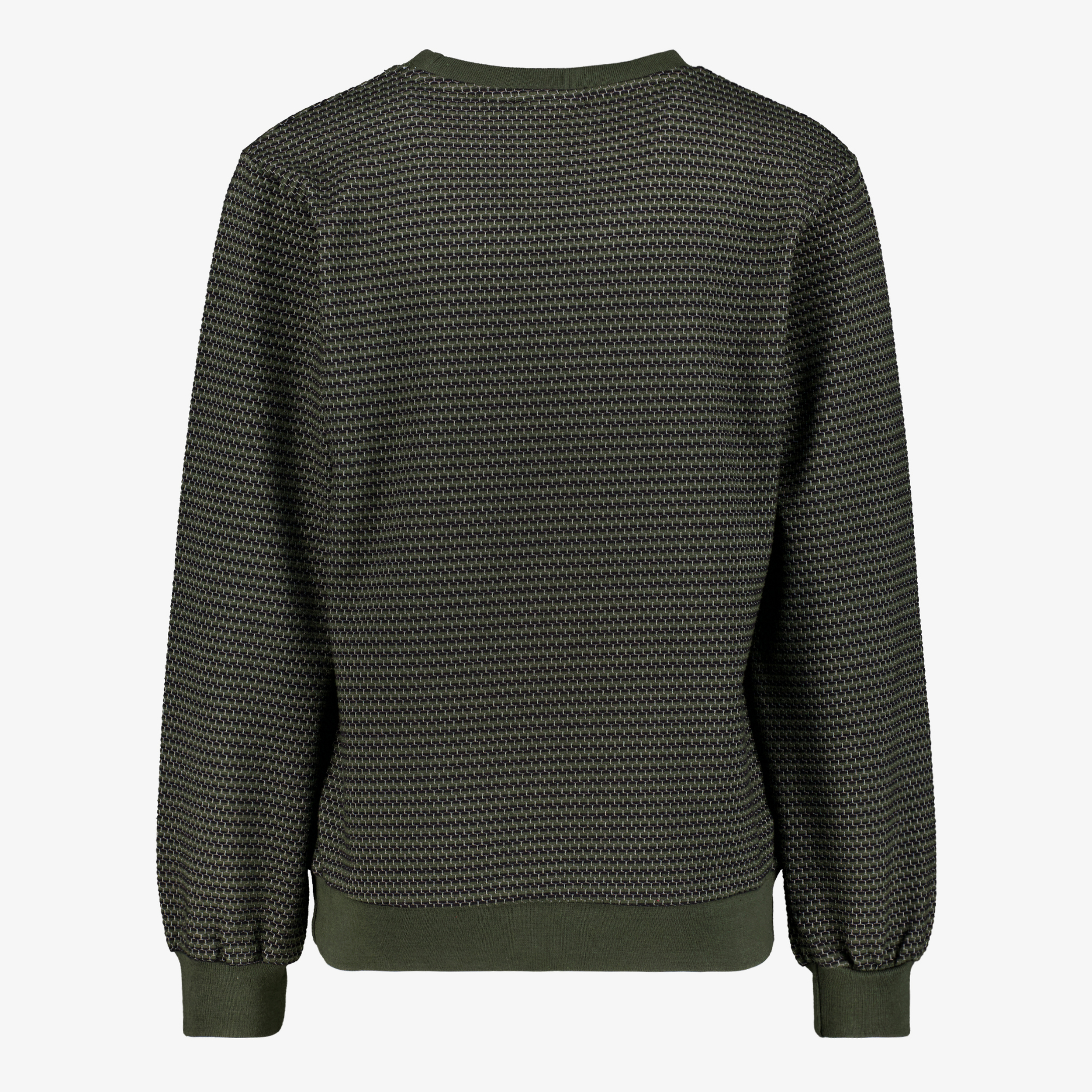 Groene Unsigned sweater voor jongens. Voorzien van een ronde hals en lange mouwen. De sweater heeft een structuur in de stof en een embleem met een wolvenkop op de borst. Gemaakt van 90% katoen en 10% polyester.