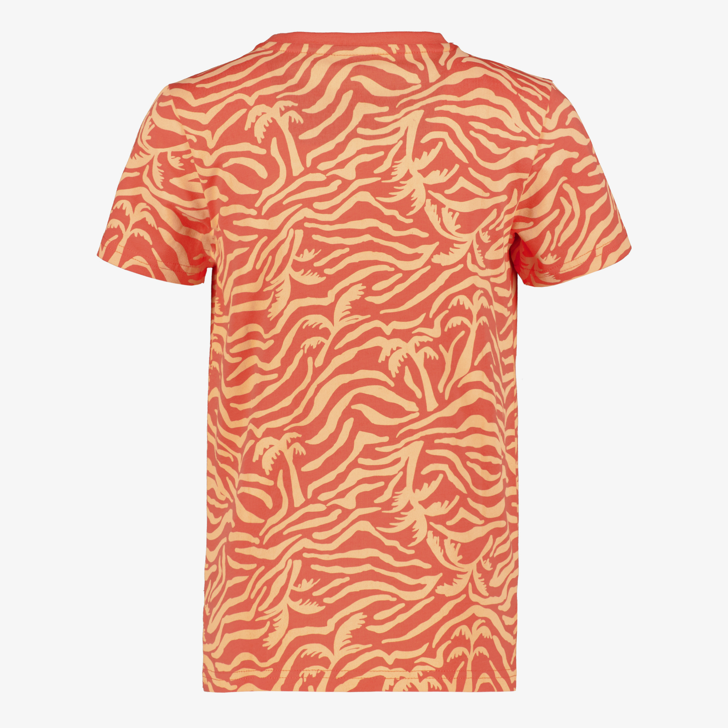 Oranje T-shirt voor jongens. Voorzien van korte mouwen, een ronde hals en all over print. Het shirt heeft een kleine tekstopdruk op de borst en is gemaakt van 100% katoen.