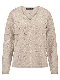 V-hals trui van FADENMEISTER BERLIN met lange mouwen. Zacht, comfortabel warm en absoluut prachtig Een droomtrui in een trendy natuurkleur met een licht transparant opengewerkt ruitpatroon en smalle geribbelde boorden. 100% scheerwol. Lengte ca. 62 cm. Deze V-hals trui is machinewasbaar. speciale fijnwas tot 30°. chloorbleken niet mogelijk. koud strijken. chemische reiniging, veilig. drogen in de droger niet mogelijk. 36, 38, 40, 42, 44, 46, 48