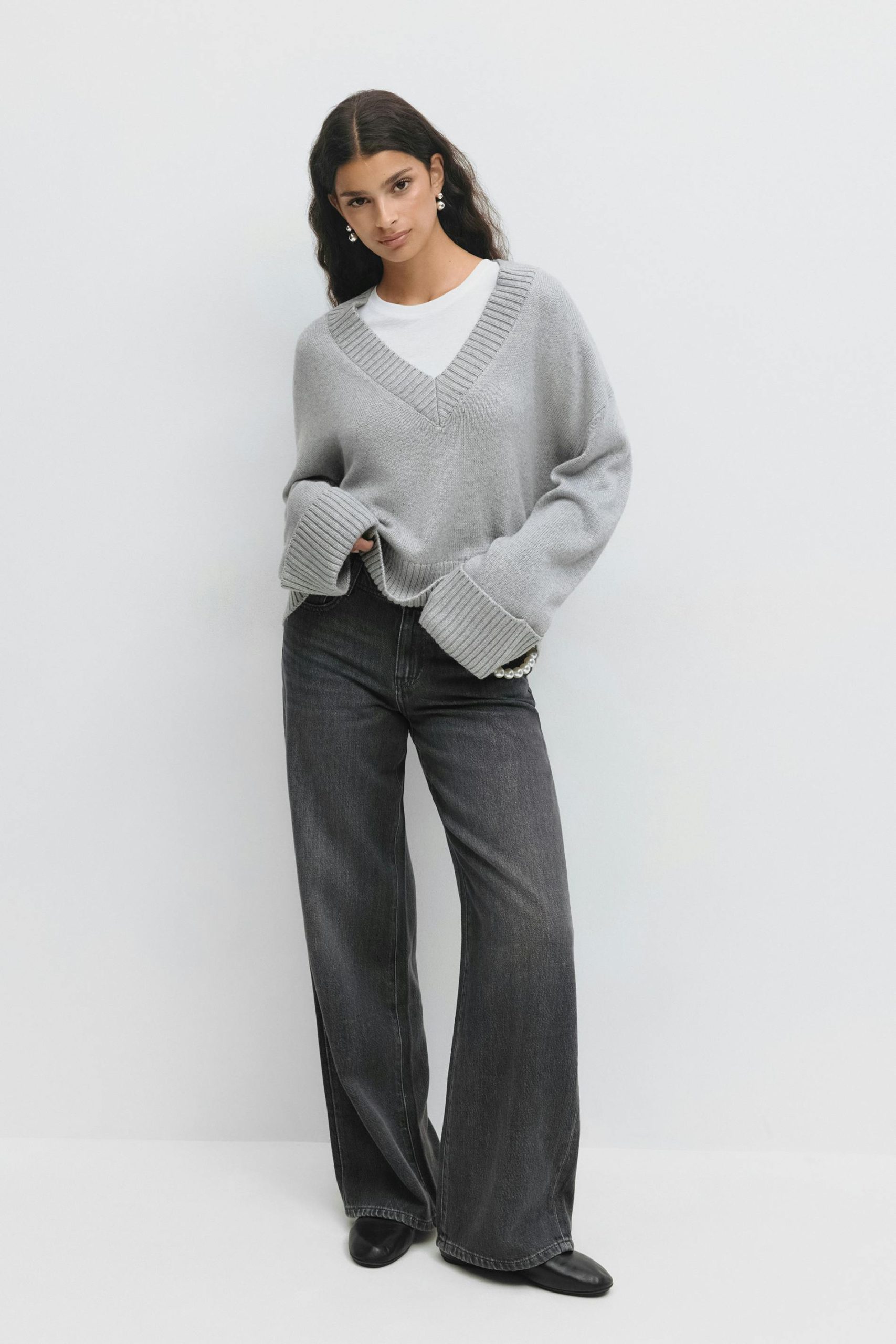Gebreide trui met v-hals. De trui is grijs en heeft lange mouw. Het heeft normale pasvorm en geribd gebreid materiaal aan de mouwuiteinden en aan de onderkant.