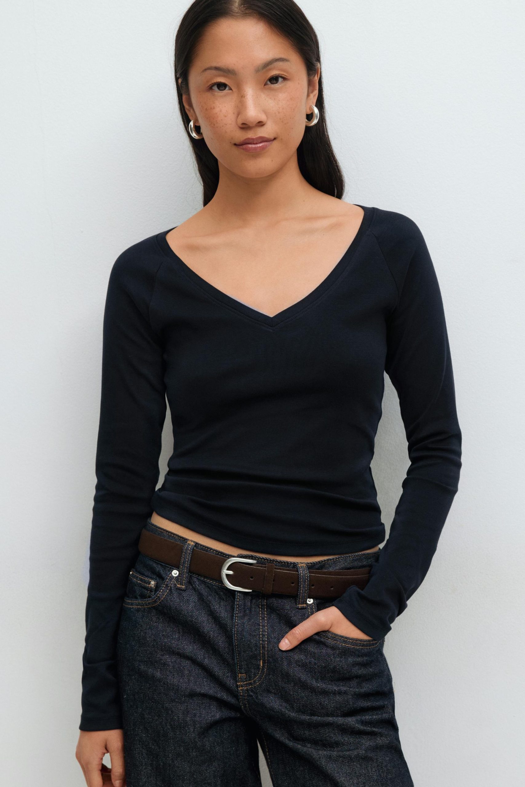 Bovenstuk met lange mouwen met v-hals. Het topje is blauw en heeft korte lengte. Het heeft nauwsluitende pasvorm.