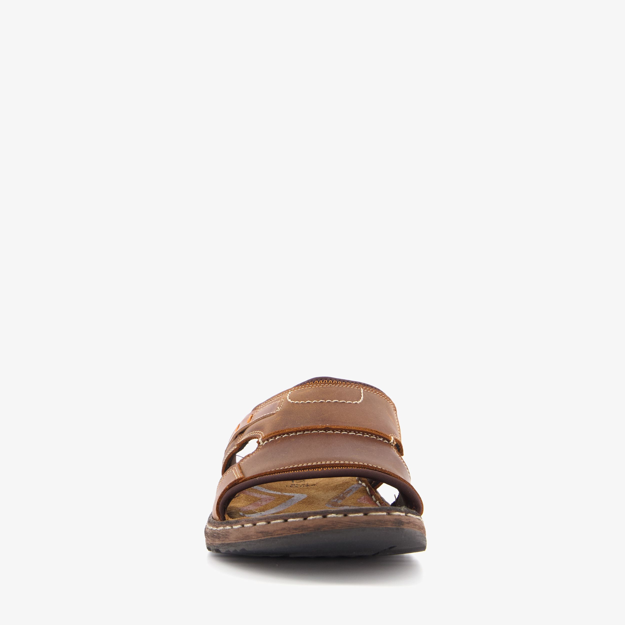 Cognac bruine slippers voor heren uit de Van Beers collectie. Gemaakt van leer, een binnenwerk van leer en een rubberen zool. De slippers hebben een comfortabel voetbed van leer en een brede voetband met openingen.