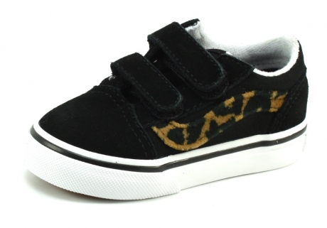 Uit de nieuwe collectie van het hippe merk Vans deze zwarte meisjes sneakers, artikel Old Skool V Leopardo. Vans zijn helemaal terug van weggeweest. Wie zich als waaghals vroeger op een skateboard door de stad heen surfte zal zich meteen kunnen identificeren met Vans! Vans meisjes sneakers zijn urban, stevig van kwaliteit en soepel. De “wafelstructuur” zool zorgt voor perfecte grip. En voor de kleinere Vans-dragers hebben deze sneakers een klittenbandsluiting. Makkelijker aan en uit te trekken! Jouw kleine meid zal helemaal de blits maken op school of op het speelplein in een paar gave, retro meisjes sneakers van Vans. Bestel ze vandaag nog online bij Stoute Schoenen ©.