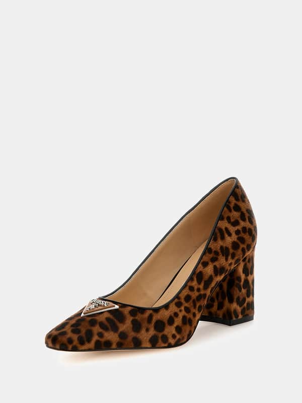 Pumps van pony skin.Vierkante neus.Hakhoogte 7 cm.Dierenprint.Driehoek logo op de voorkant.Samenstelling bovenkant: 95% Echt leer, 5% Polyurethaan.Binnenzool en binnenvoering van leer.Rubberen zool met schokdemping.