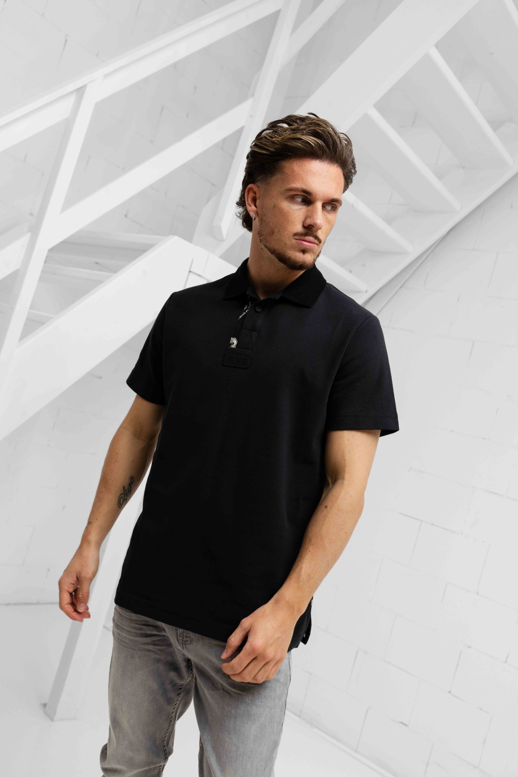 De Versace Jeans Couture Contrast Barocco Polo voor heren in het zwart is een must-have item voor de Lente/Zomer collectie. Deze polo heeft een klassieke kraag en korte mouwen, gemaakt van 100% katoen voor een comfortabele pasvorm. De regular fit zorgt voor een stijlvolle uitstraling, terwijl het opvallende backprint patroon een trendy twist geeft aan het geheel. De knoopsluiting aan de voorkant maakt het gemakkelijk om de polo aan en uit te trekken. Met deze polo van het iconische merk Versace Couture ben je verzekerd van een modieuze look voor elke gelegenheid. Geen zakken aanwezig voor een strakke en minima