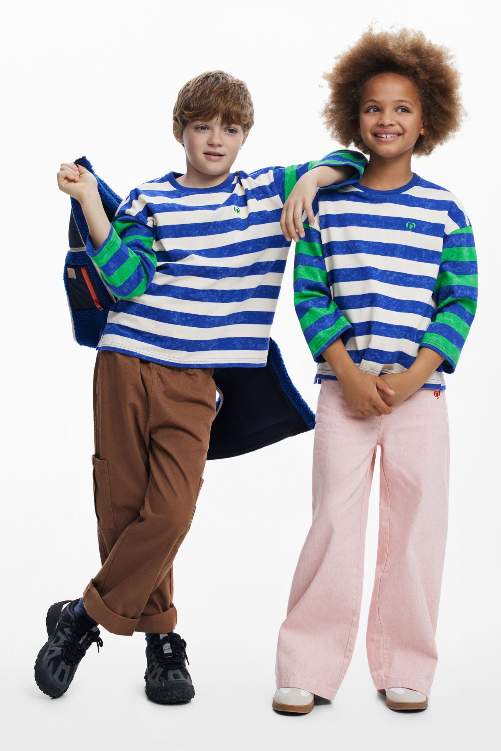 T-shirt van katoen, met lange mouwen en ronde hals, met gecombineerd streeppatroon, versleten effect en logodetail.