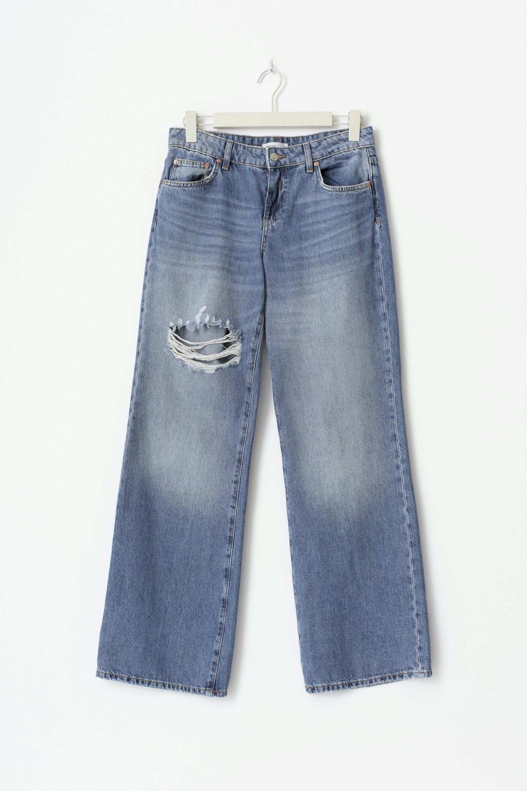 Petite jeans met brede pijpen van niet-elastisch denim met een scheur aan de voorkant. De spijkerbroek is blauw en heeft een gulp. Het heeft zakken aan de voor- en achterzijde, volledige lengte en een midden taille. Perfect voor personen die 160 cm (5 ft 3 in.) of kleiner zijn.