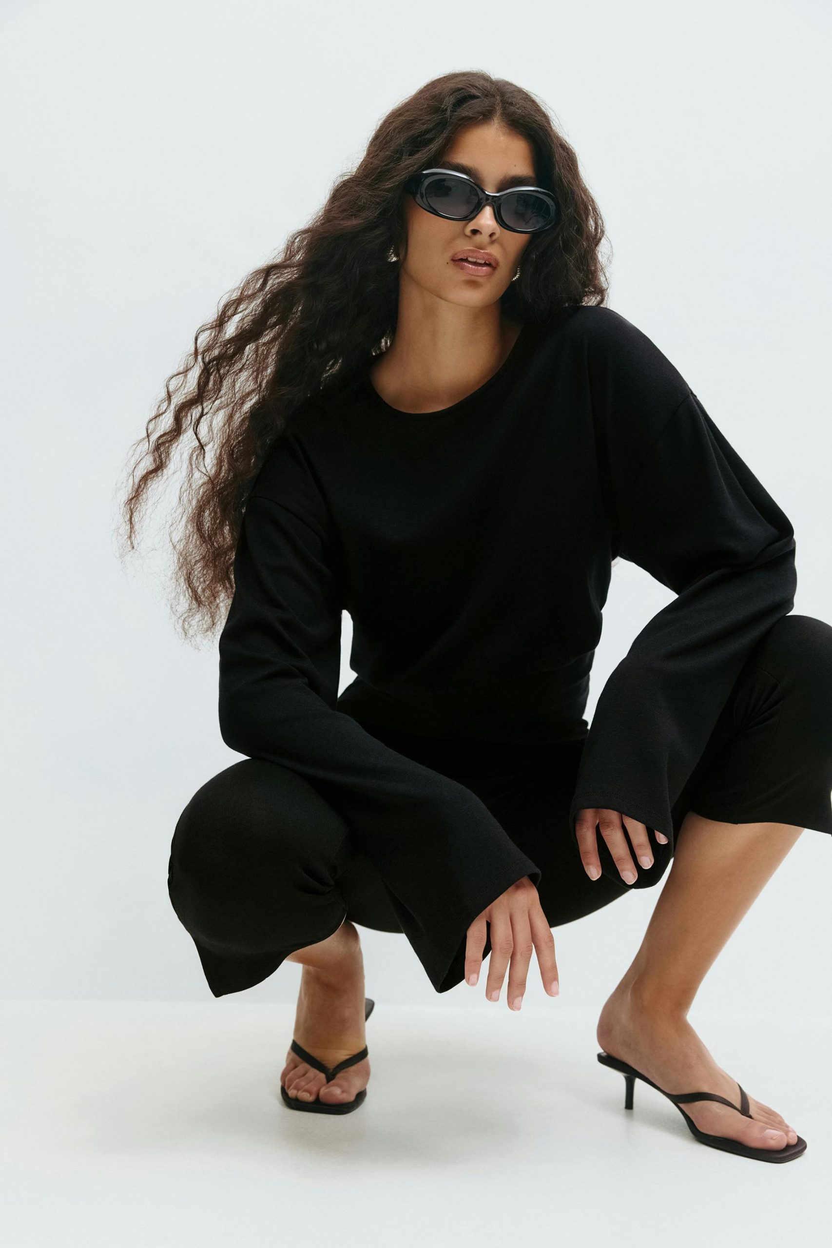 Topje met brede mouwen. Het topje is zwart en heeft toelopende taille. Het heeft ronde halslijn, normale pasvorm, gerimpelde naden aan de taille en afgesneden lengte.