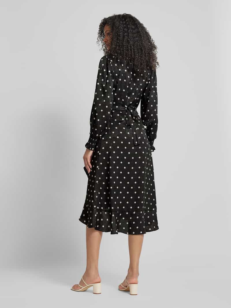 Wikkeljurk van Neo Noir;Nauwsluitende pasvorm;Midi-jurk;Model ‘Eva’;Retrolook;V-hals;Volantzoom;Gesmokte mouwboorden;Ruglengte bij maat 36: 123 cm;Borstomvang bij maat 36: 45 cm;Mouwlengte bij maat 36: 63 cm