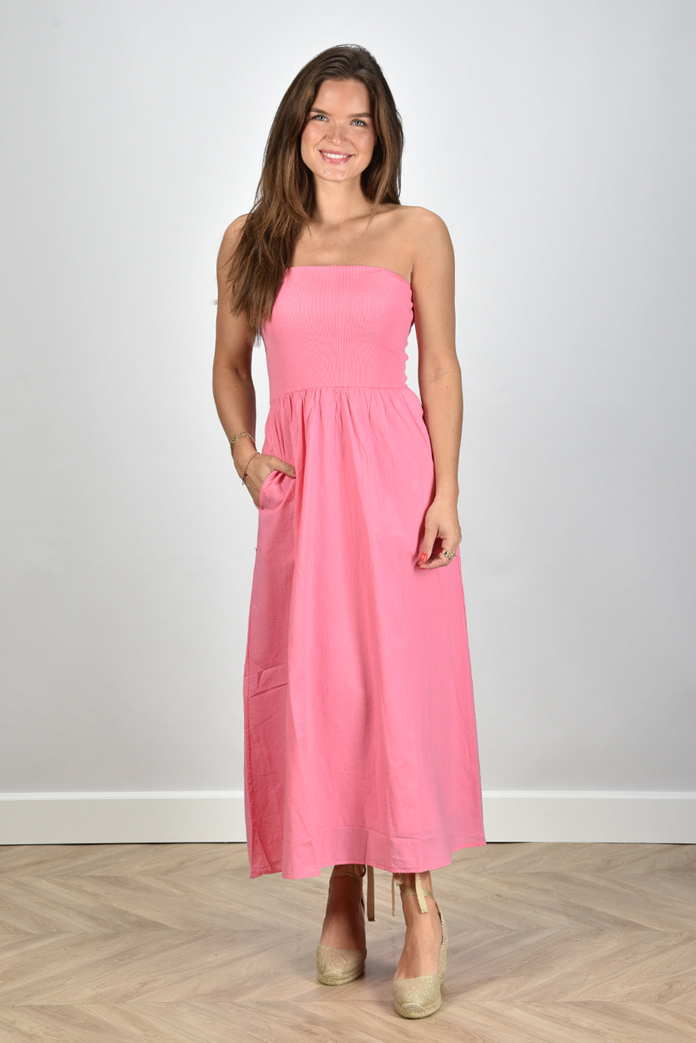Prachtige jurk van Xirena, model Finnian in de kleur rose pink. De jurk heeft een prachtige zomerse kleur waardoor hij perfect is voor de warmere dagen. Verder heeft hij een strapless model. Draag deze jurk met sandalen of castaner voor een zomerse look. Ook kun je over deze jurk een blouse dragen van Xirena. Deze jurk valt normaal. Model is 1,73m, is maat M en draagt maat M.