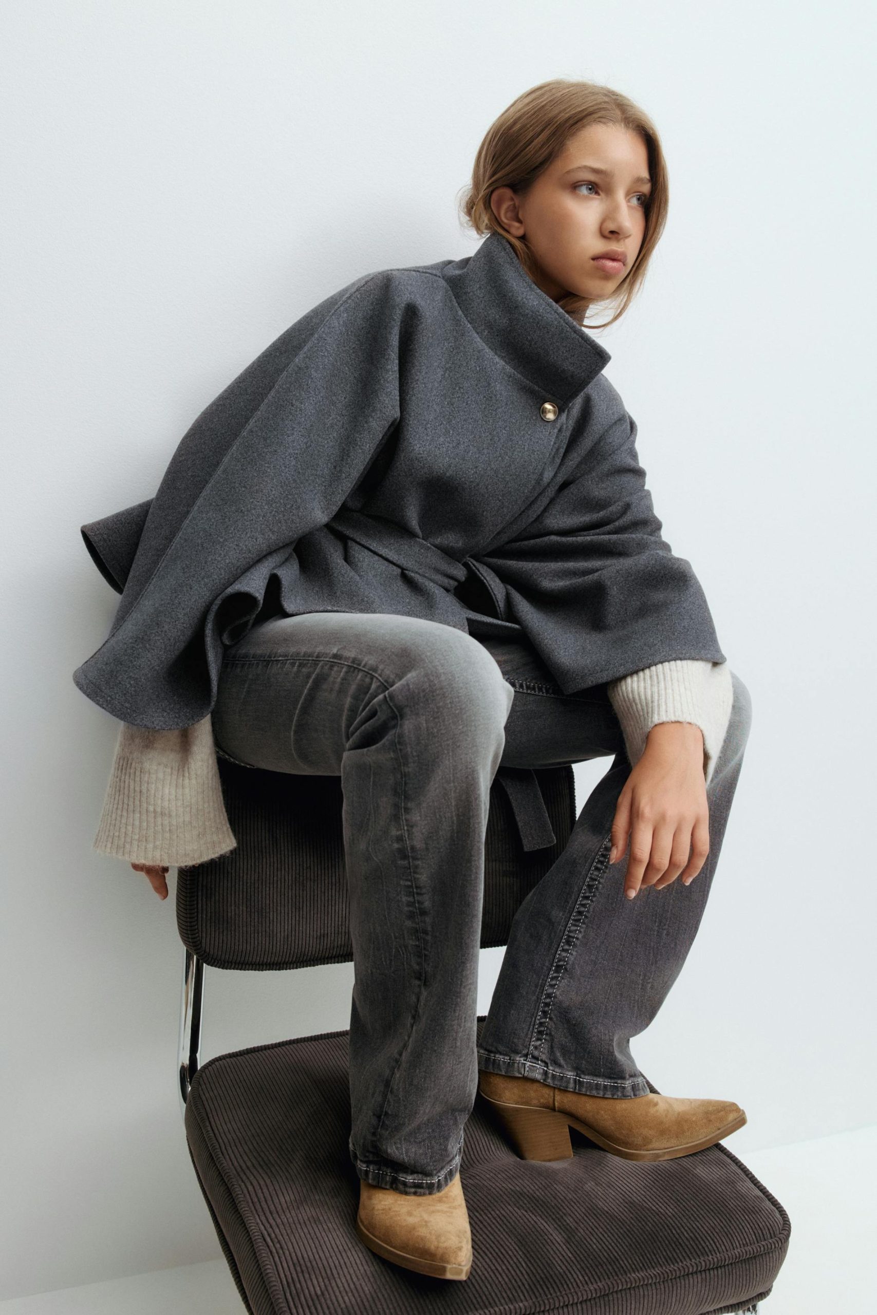 Korte cape met knoopriem aan de taille. De jas is grijs en heeft gouden knop aan de bovenkant. Het heeft overmaatse pasvorm, hoge kraag, hangende schouders, lange en brede mouwen en zakken in de zijden.