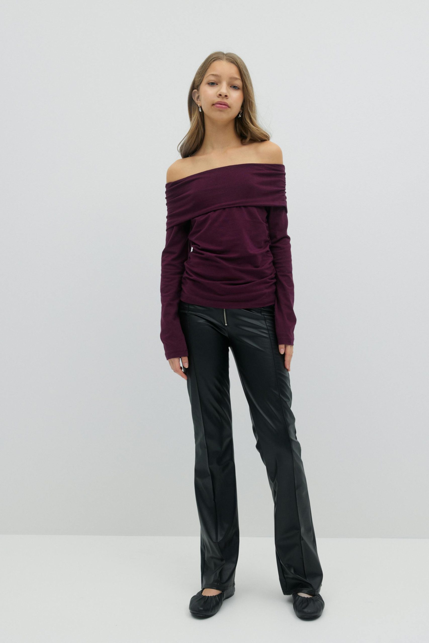 Lederen broeken van namaakleer met lage taille. De broeken zijn zwart en hebben rits aan de voorkant. Het heeft uitlopende pijpen, elastische kwaliteit, gleuven aan de voorkant en riemlussen.