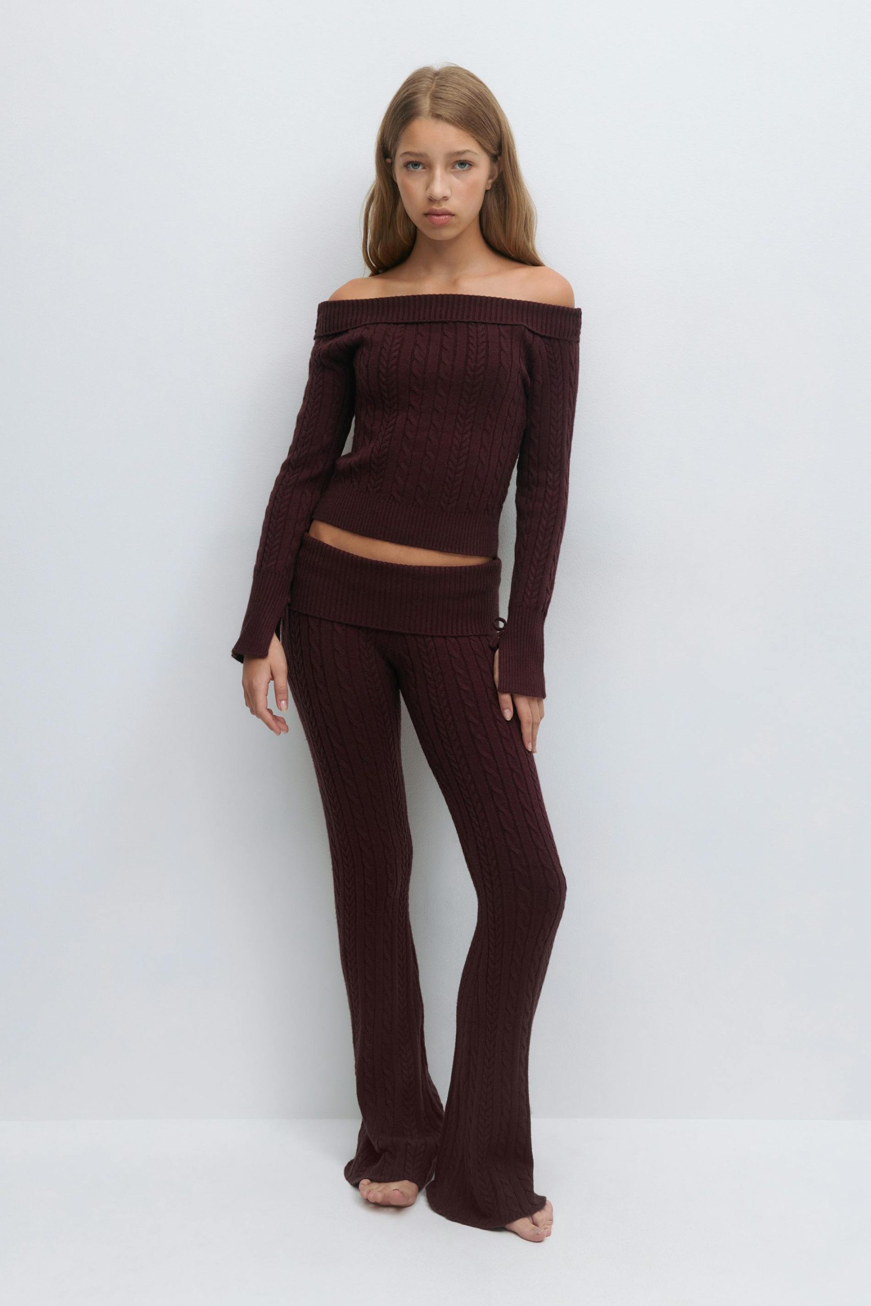 Kabelgebreide broeken met omvouwbaar en geribbeld taille. De broeken zijn wijnrood en hebben uitlopende pijpen. Het heeft zacht materiaal en lage taille.