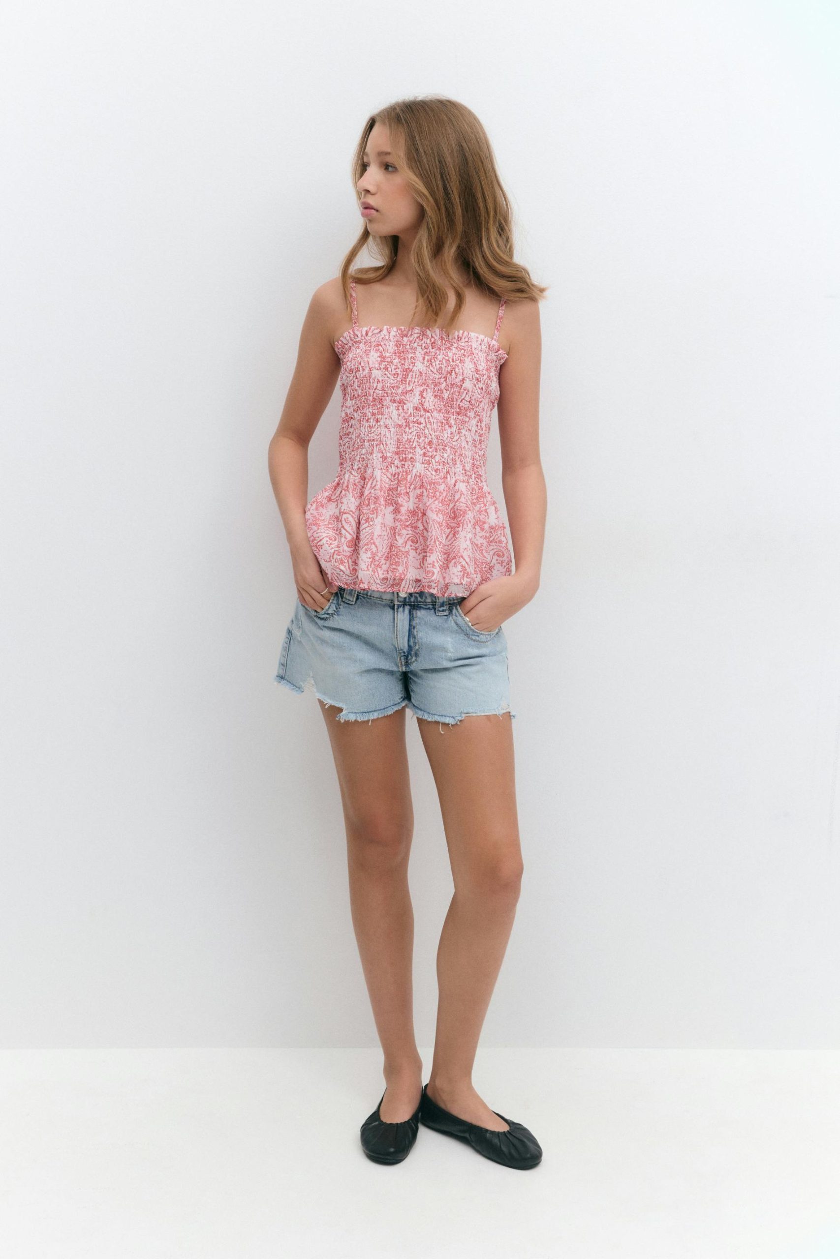 Korte jeansshort met een lage taille. De short is licht blauw en heeft een losse pasvorm. Het heeft een niet-elastisch materiaal, een elastische tailleband, een gulp, zakken aan de voorkant, klepzakken achter en geborduurde details op de zakken.