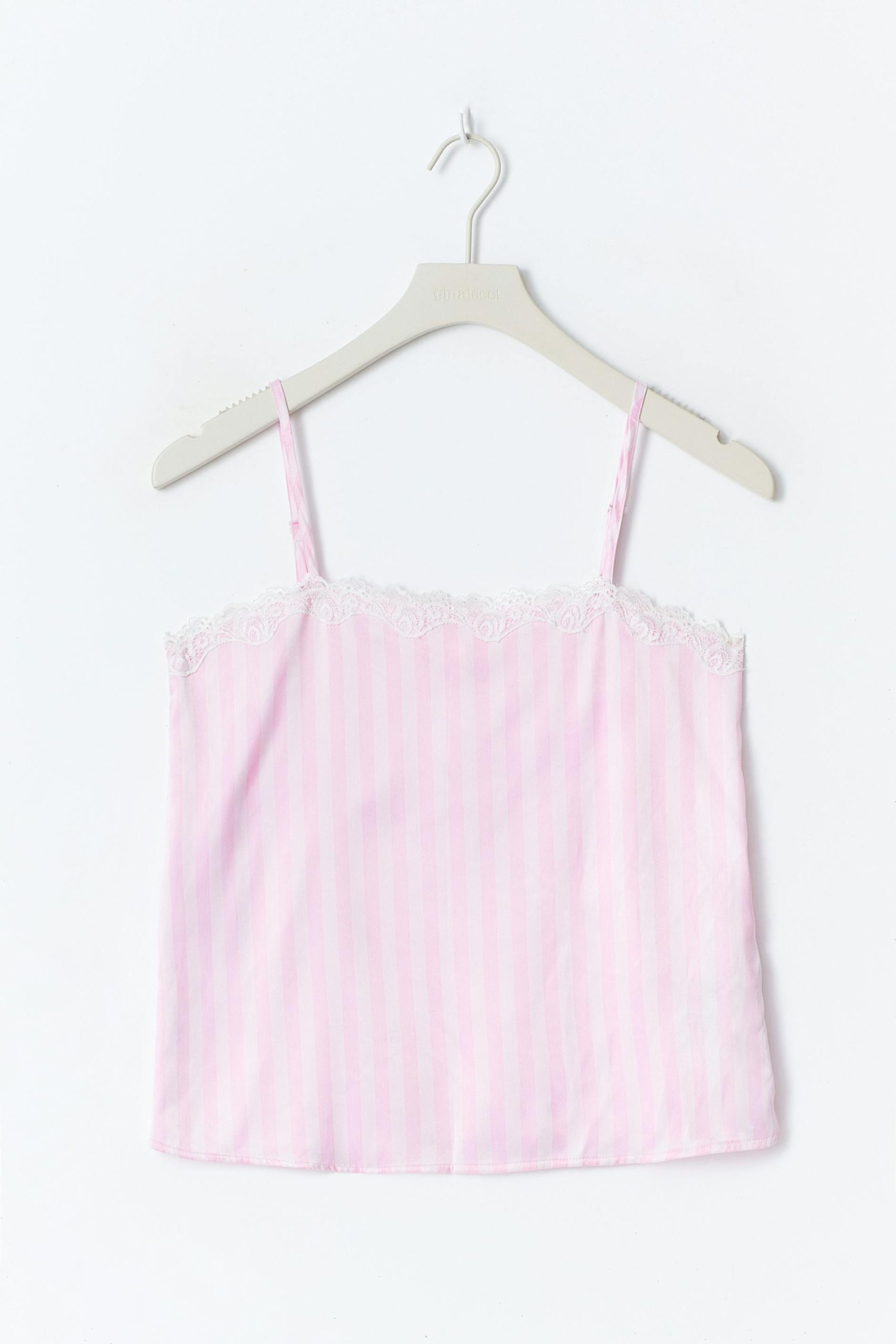 Gestreepte pyjamaset met normale pasvorm. De pyjamaset is roze en heeft een pyjamahemdje met kant aan de bovenkant, aanpasbare schouderriemen en afgesneden lengte. Het heeft korte pyamashort met ruchesrand aan de onderkant, elastiek aan de taille en een lage taille.