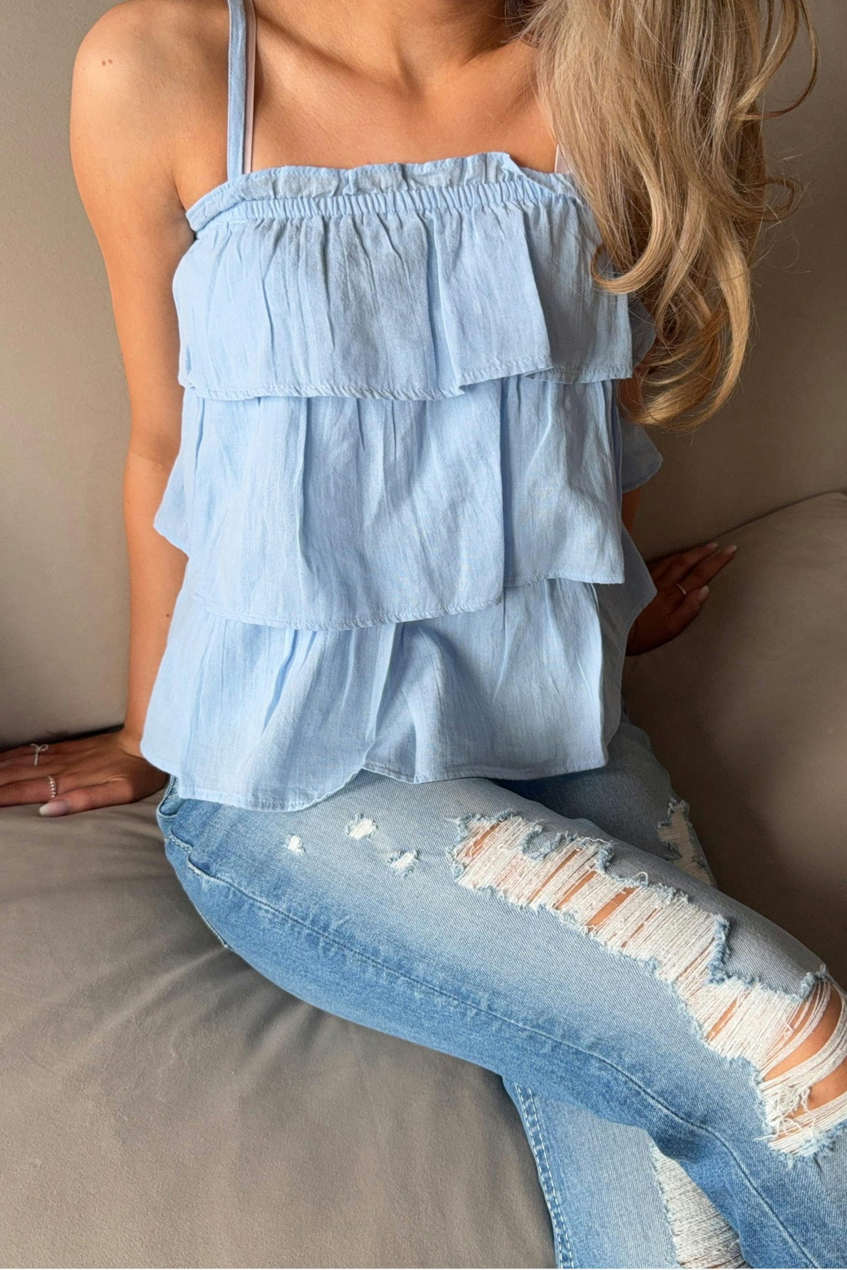 Mouwloos topje met ruches van katoen met verstelbare schouderriemen. Het topje is blauw en heeft normale maat.