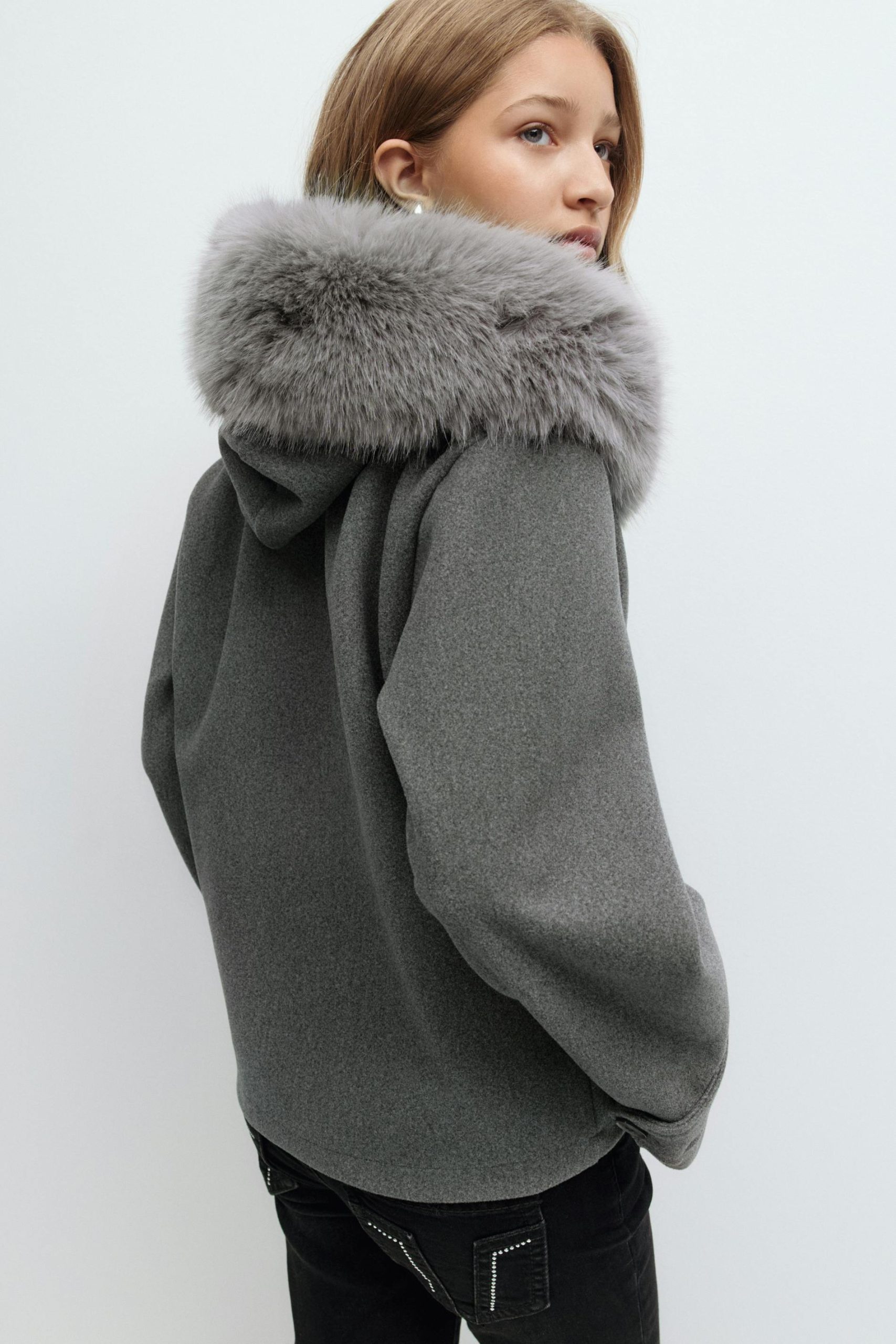 Jas met afneembare pelskraag. De jas is grijs en heeft dichtknopen aan de voorkant. Het heeft overmaatse pasvorm, zakken in de zijden, hangende schouders en lange mouwen. Ongevoerd.