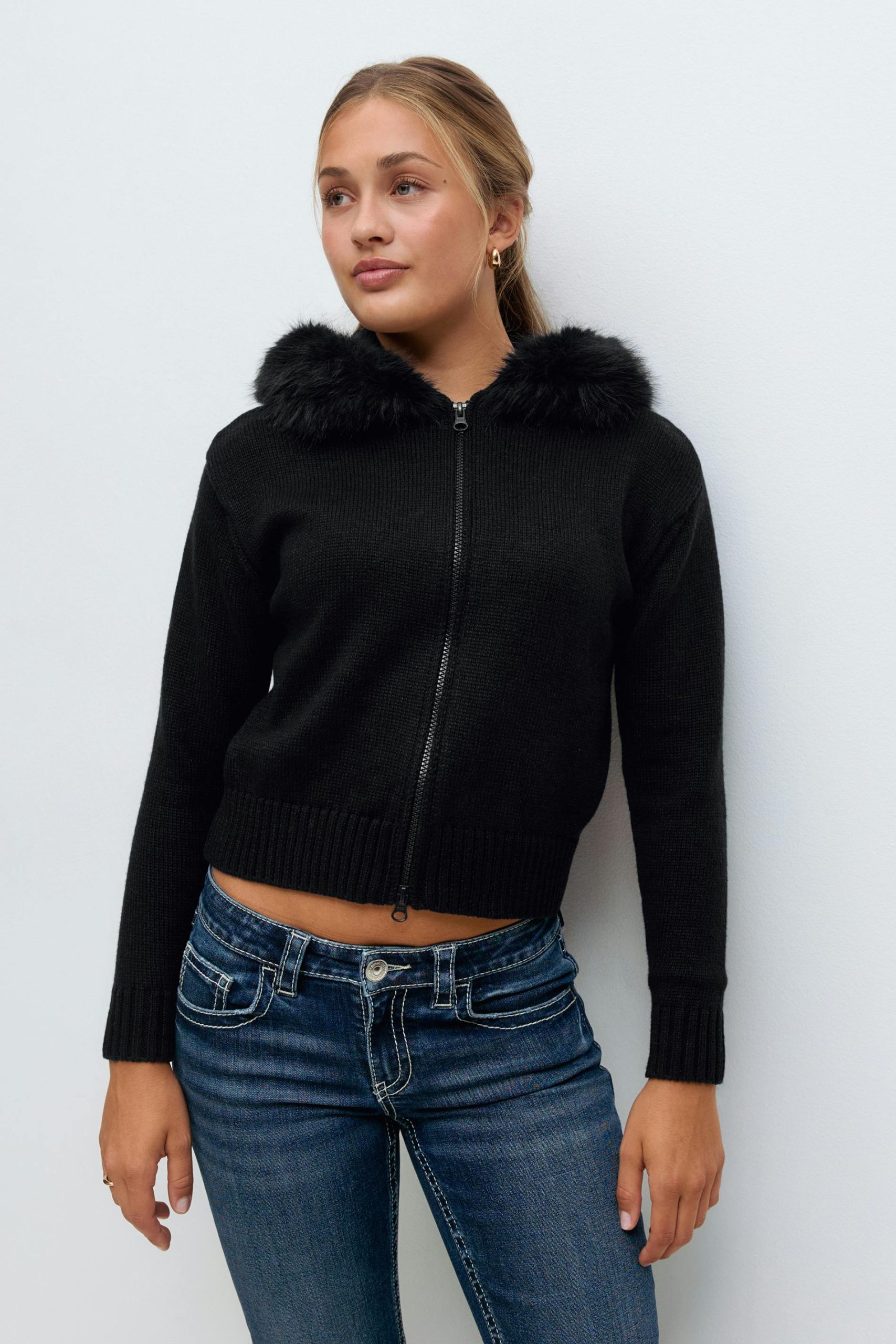 Gebreide hoodie met nauwsluitende pasvorm. De hoodie is marineblauw en heeft capuchon met namaakbont. Het heeft lange mouw, afgesneden lengte, tweezijdige ritssluiting aan de voorkant en geribbelde manchet aan de mouwuiteinden en aan de onderkant.