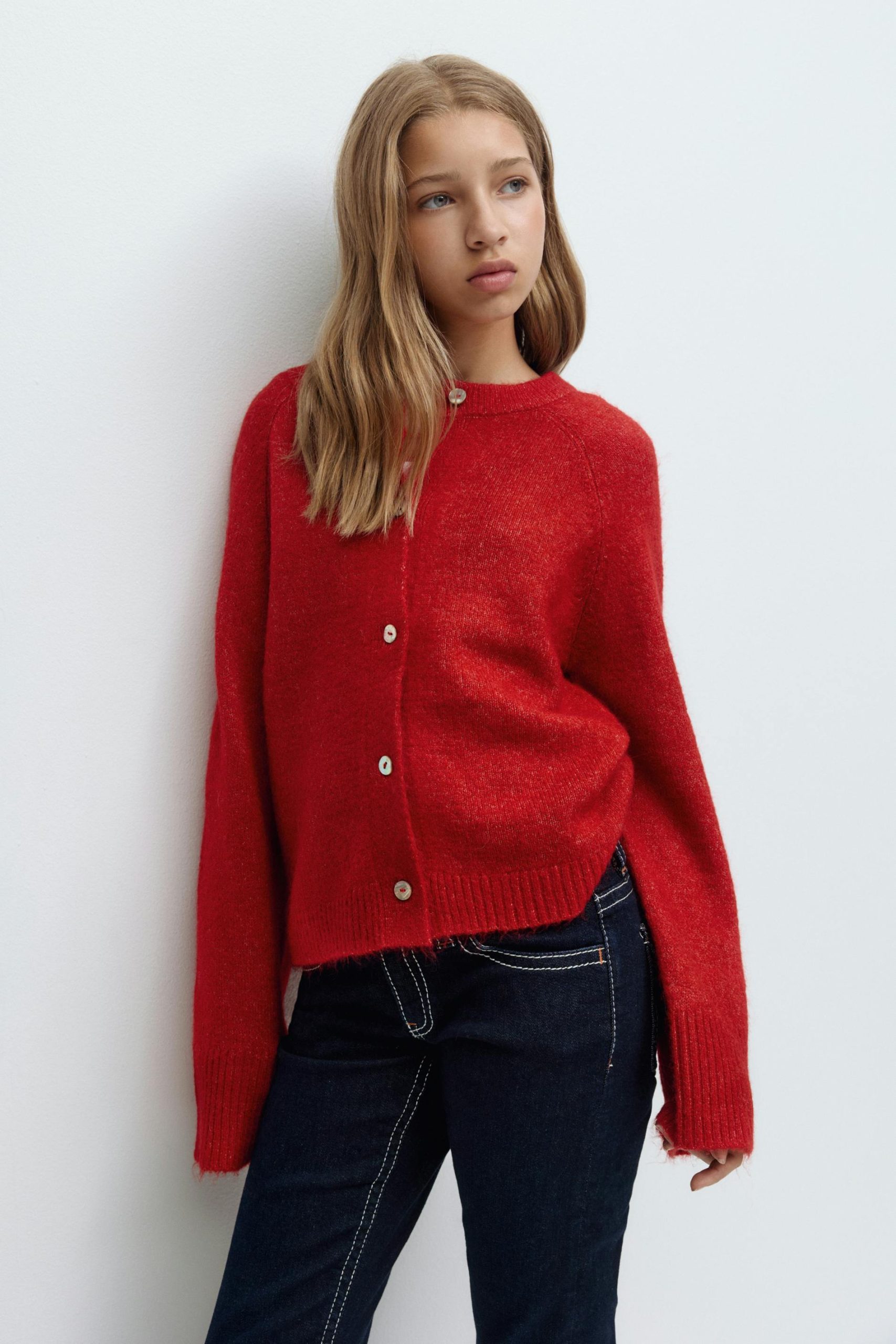 Gebreide cardigan van wolmix met knoppen aan de voorkant. De cardigan is rood en heeft lange mouwen. Het heeft normale pasvorm, ronde halslijn en geribd gebreid materiaal aan de mouwuiteinden.