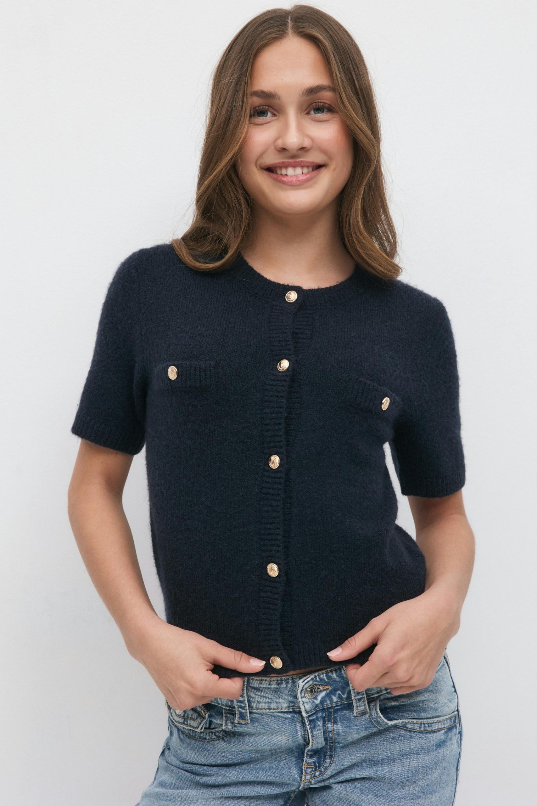 Vest met korte mouwen met goudknopen aan de voorkant. Het vest is marineblauw en heeft ronde halslijn. Het heeft normale pasvorm en zakken aan de voorkant.