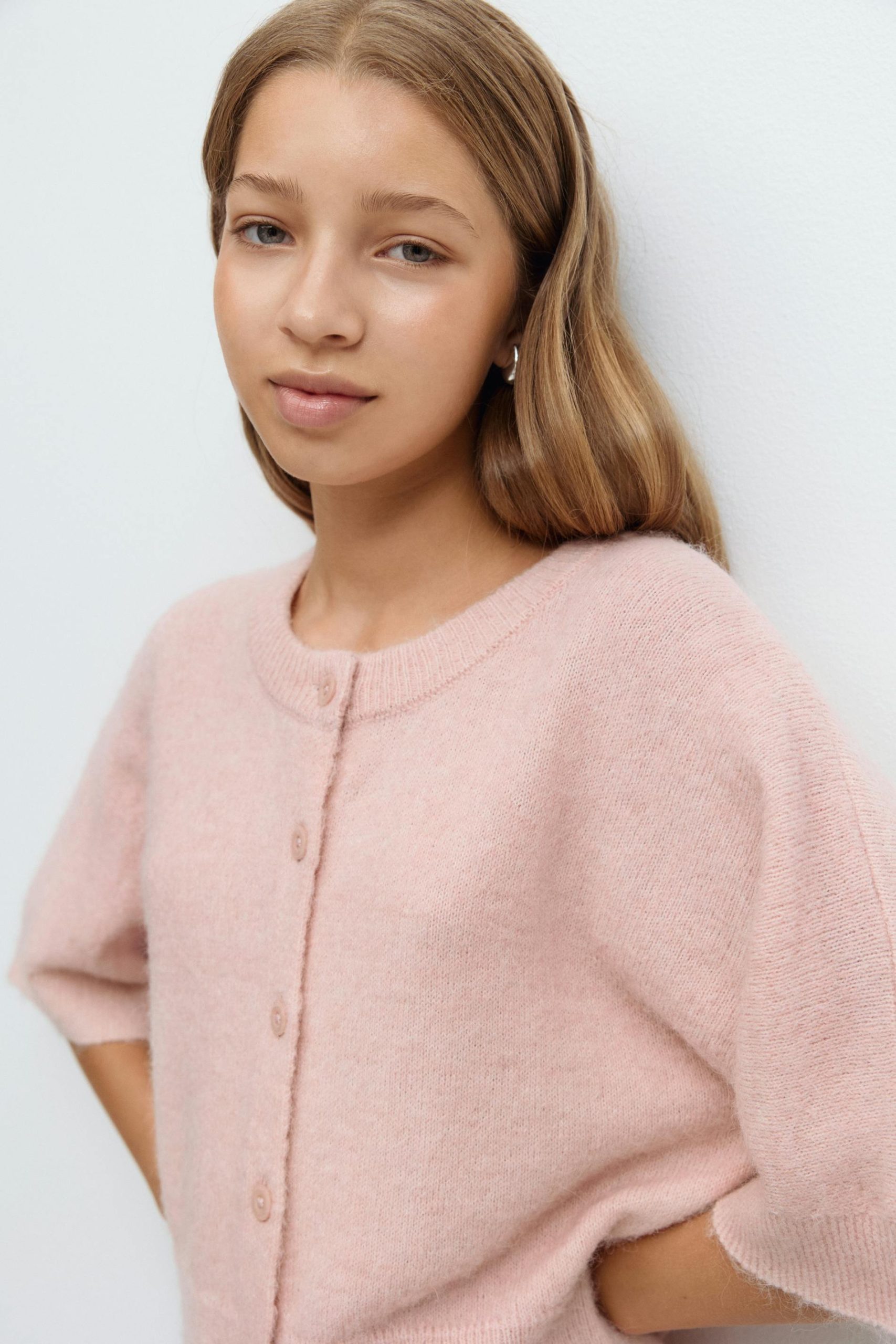 Gebreide trui met korte mouwen van alpacamix met toelopende taille. De trui is roze en heeft zacht materiaal. Het heeft nauwsluitende pasvorm, ronde halslijn, knoppen aan de voorkant en geribd gebreid materiaal aan de mouwuiteinden en aan de onderkant.