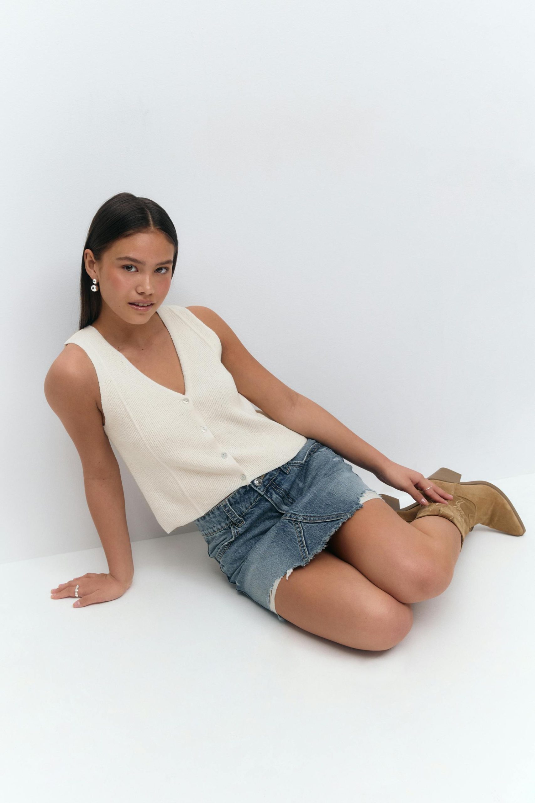 Gebreide vest met v-hals. Het vest is wit en heeft knoppen aan de voorkant. Het heeft geribd gebreid materiaal, naden aan de voorkant en normale pasvorm.