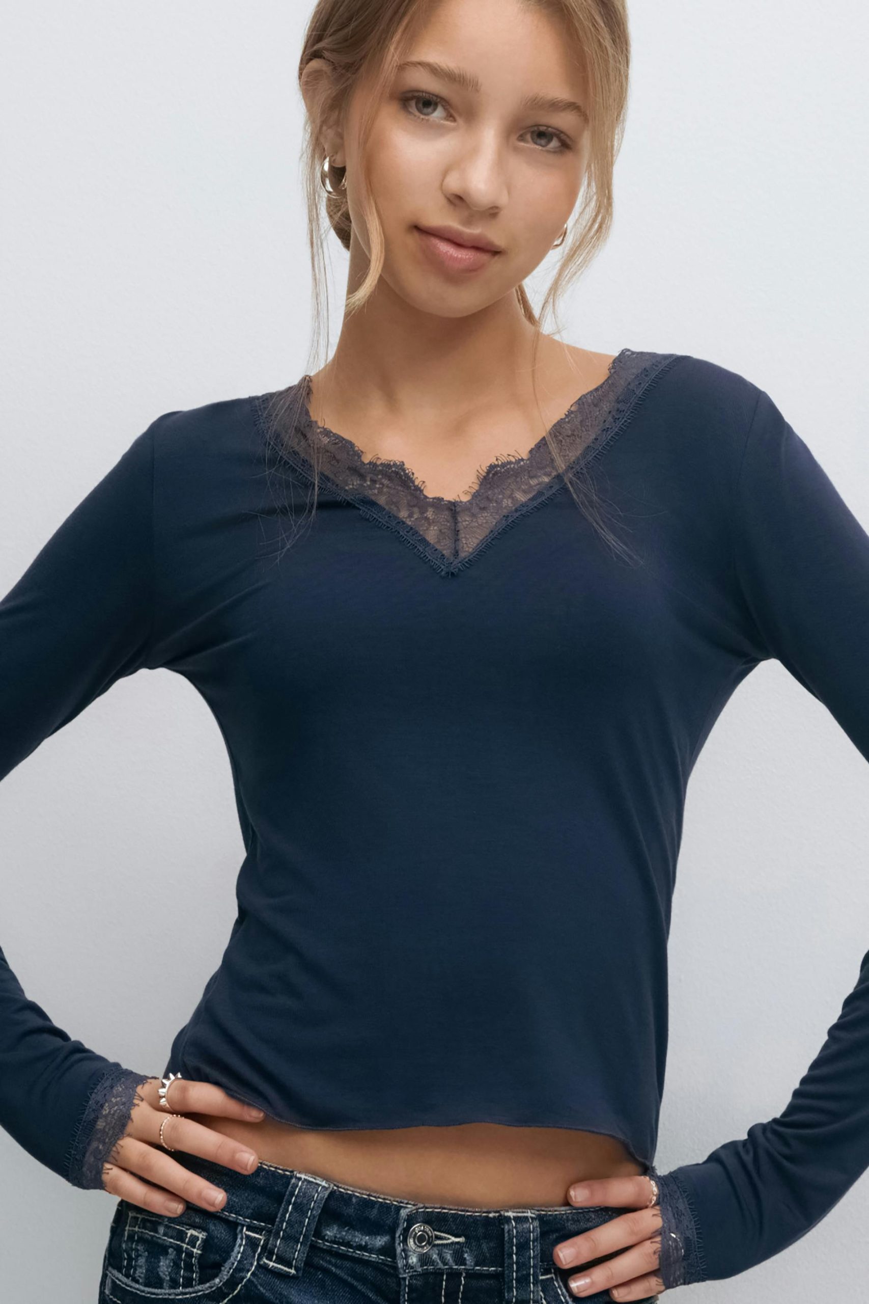 Topje met kant aan de halslijn en aan de uiteinden van de mouwen. Het topje is marineblauw en heeft lange mouwen. Het heeft v-hals en normale pasvorm.
