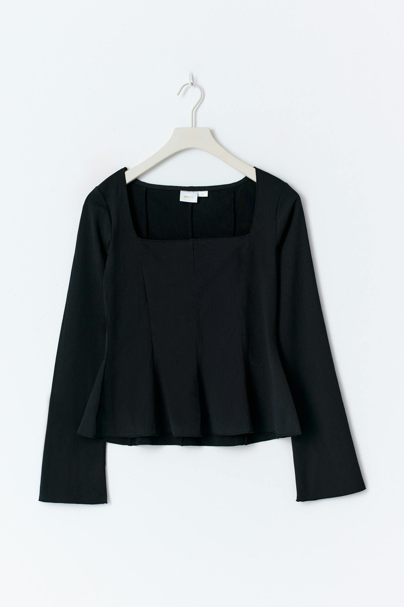 Peplum-topje met lange mouwen met vierkante halslijn. Het topje is zwart en heeft lantaarnmouwen. Het heeft gevormde naden, uitlopende zoom en normale lengte.