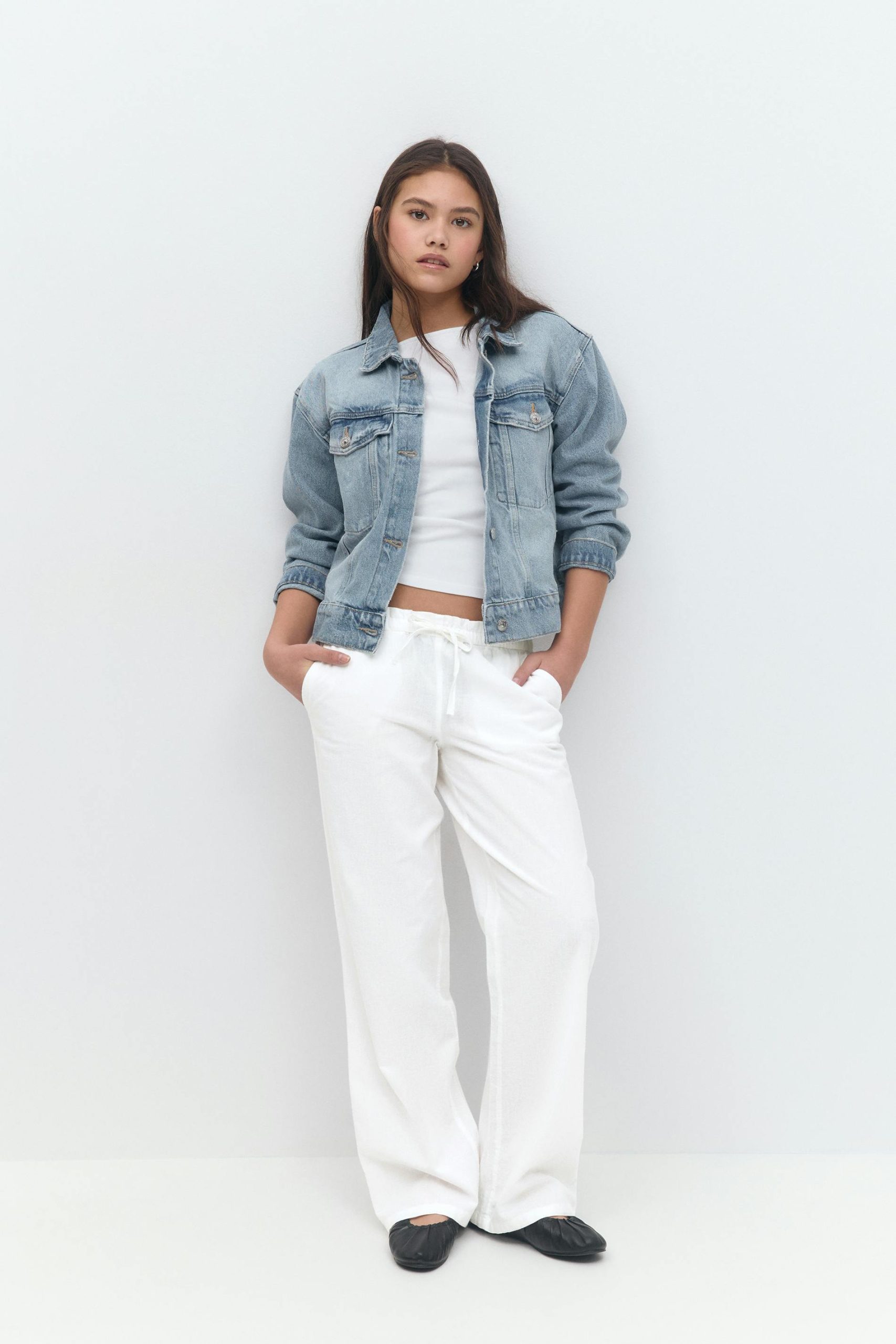 Linnen broeken met lage taille. De linnen broeken zijn wit en hebben elastische tailleband met broeken met wijde pijpen. Het heeft zakken aan de zijkanten en achterzakken.