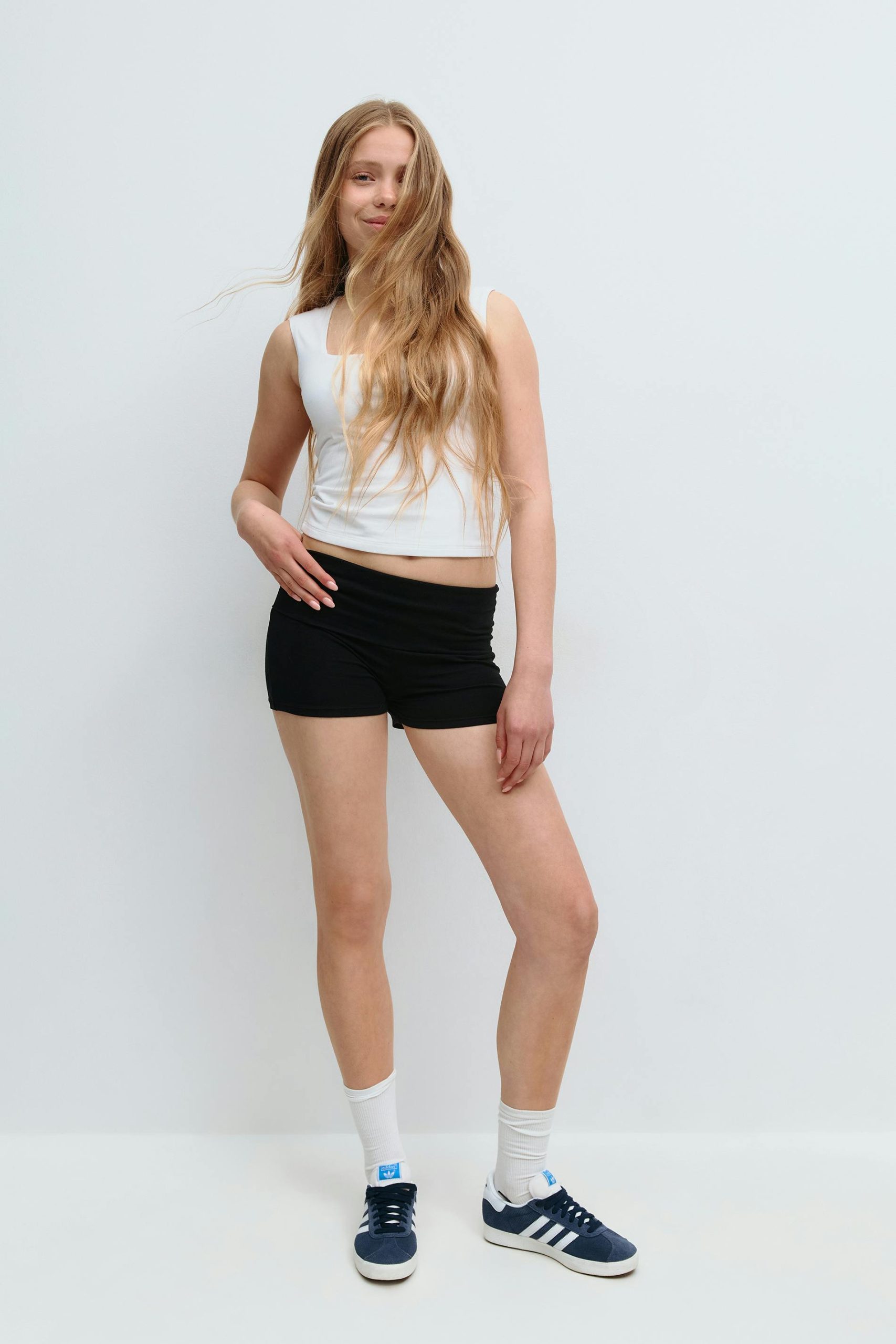 Korte yogashort van zachte jersey met omvouwbare tailleband. De short is zwart en heeft lage taille.• Leverancier: Fakir