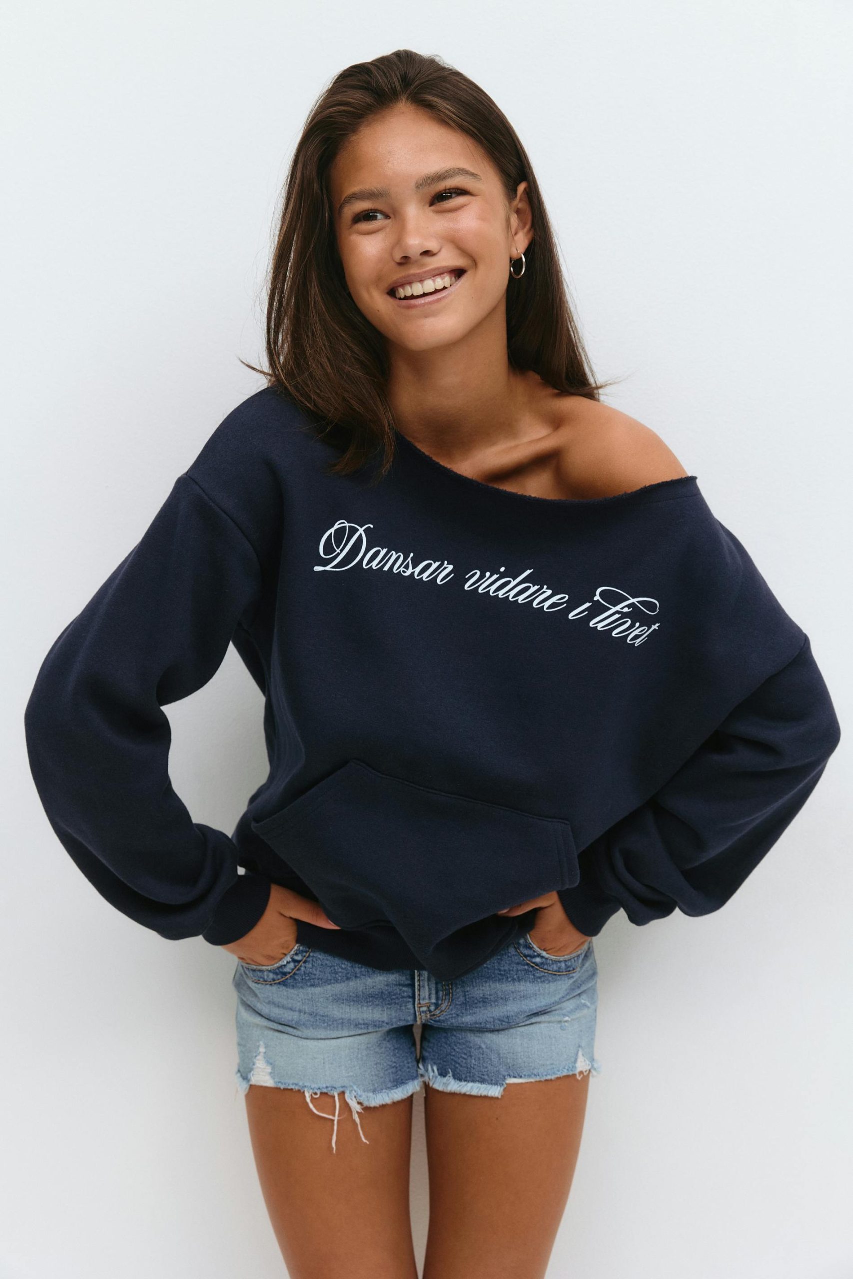 Blote schouder sweater met lange mouwen met tekst print aan de voorkant. De sweater is marineblauw en heeft overmaatse pasvorm. Het heeft een boot halslijn, ruwe rand aan de bovenkant, kangeroezak aan de voorkant en ribbels aan de mouwuiteinden en aan de onderkant. Print: Dansar vidare i livet.